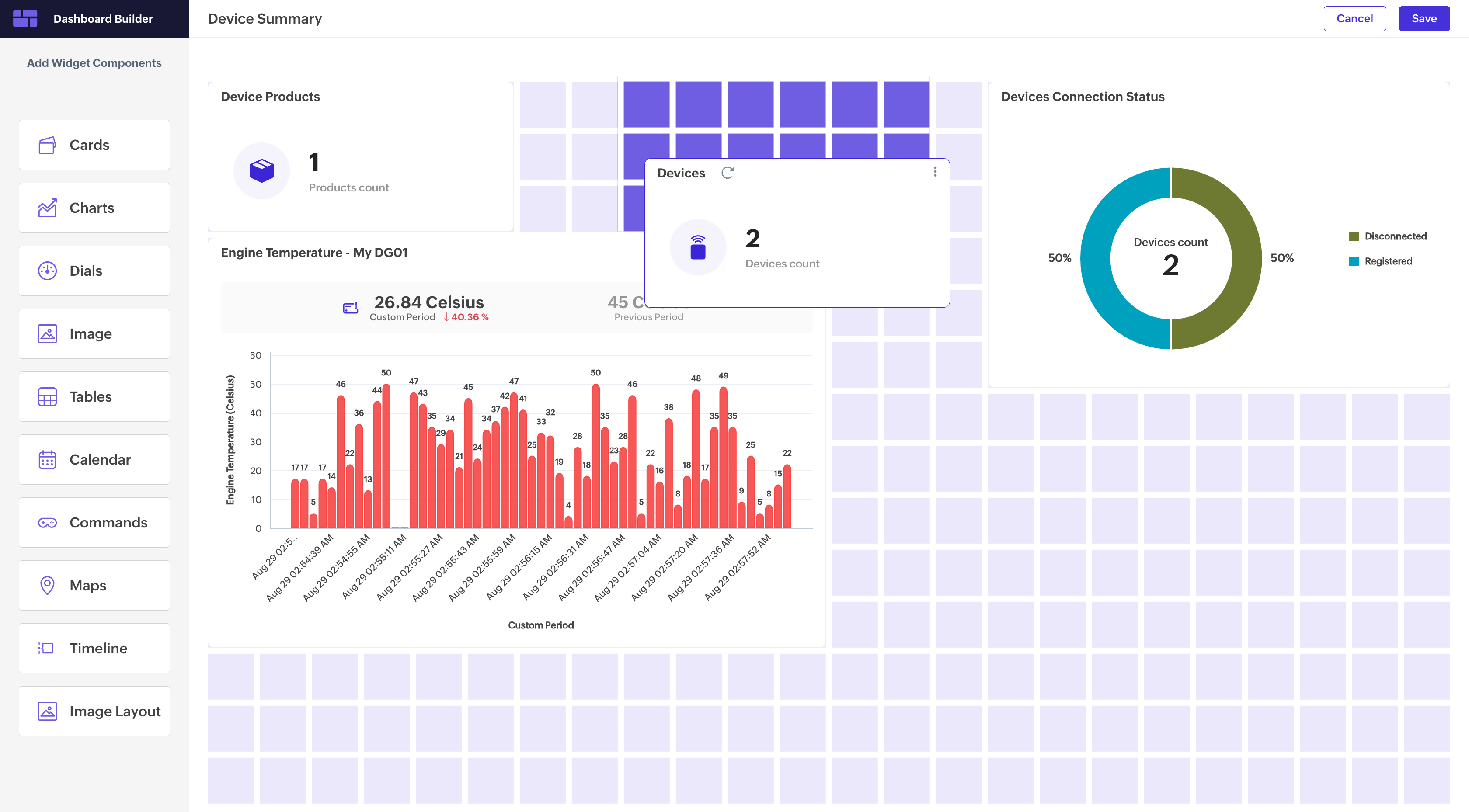 The dashboard builder is a tool to perform actions such as resizing and rearranging the widgets on the dashboard grid by simple drag and drop actions.
