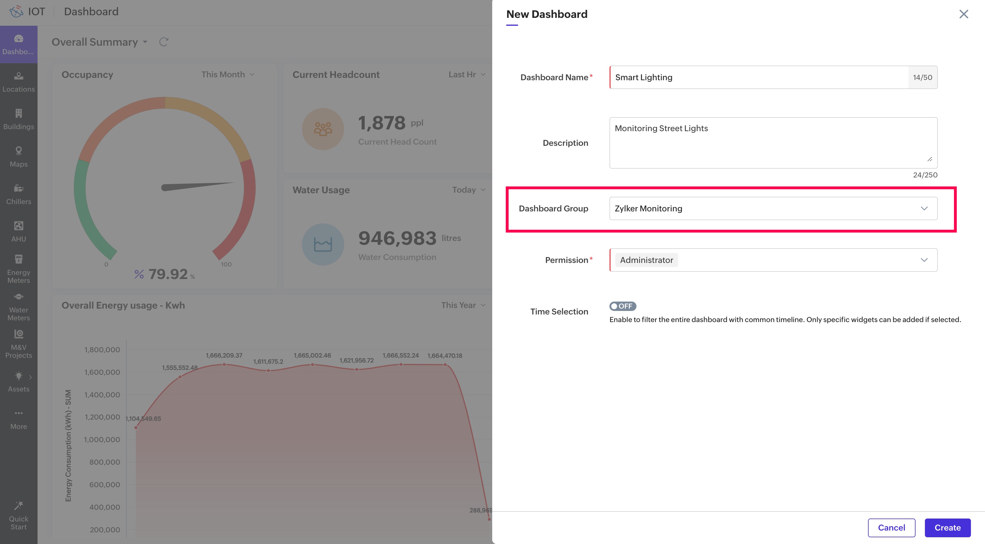 Dashboards can be grouped to streamline access and enable users to find and display dashboards easily. For example, dashboards for specific user profiles can be grouped together. All dashboards relevant to supervisors can be grouped under the "Supervisor Dashboards" group. Similarly, location-based monitoring dashboards can be grouped under the location's name. For example, all dashboards related to energy monitoring, smart lighting, and so on, in the location Zylker Chennai office can be grouped under "Zylker Monitoring".
