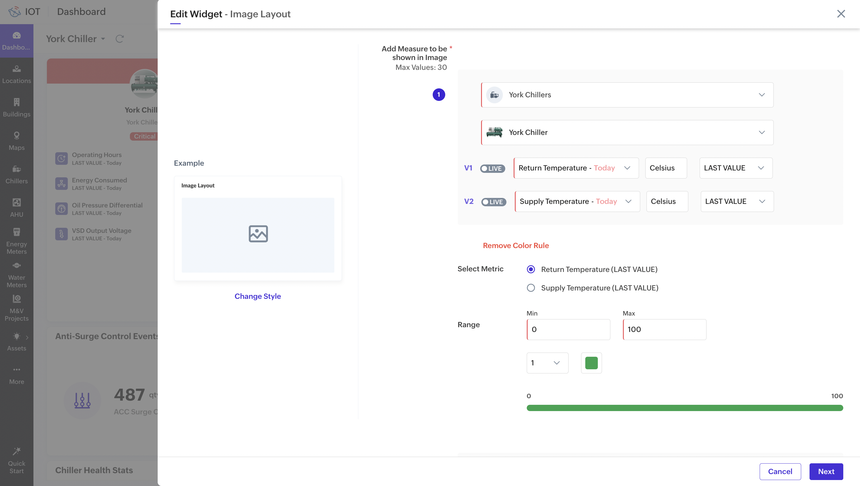 11. Click Next to display the Image Layout widget view with the configured metric value display cards.