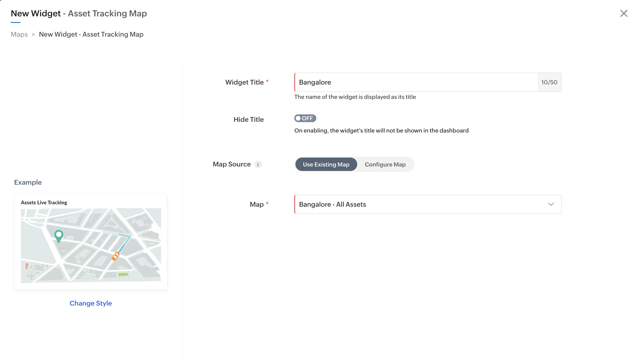 Use Existing Map: Set the toggle to Use Existing Map to select an already created map which you want to display in the widget.