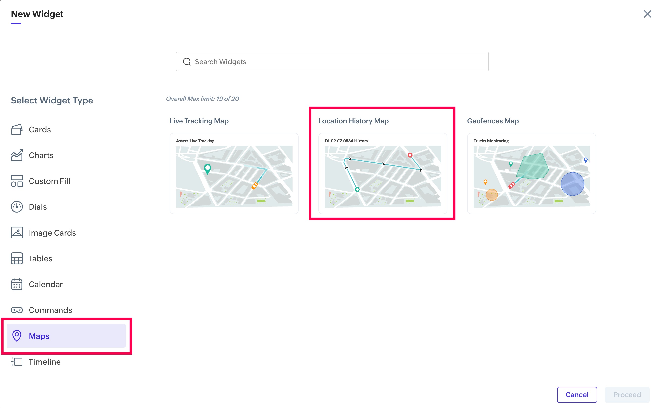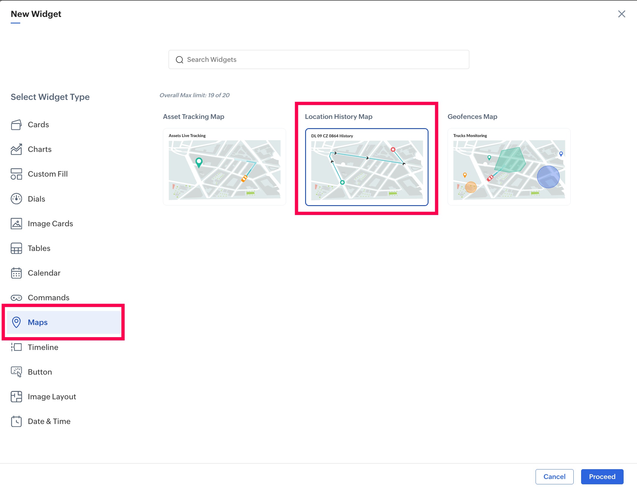 3. Select Maps from the type of widgets displayed, and select Location History Map, then click Proceed.