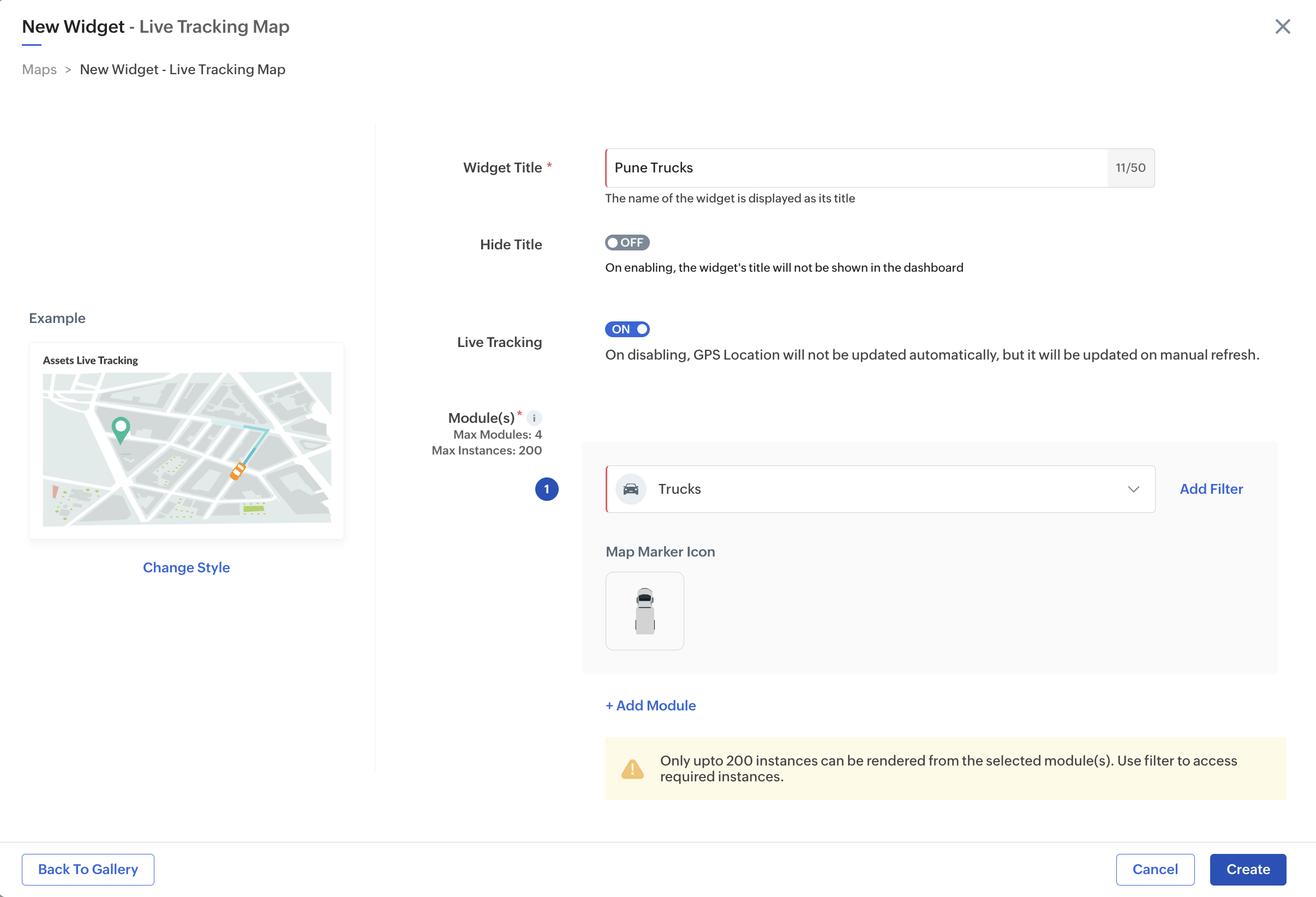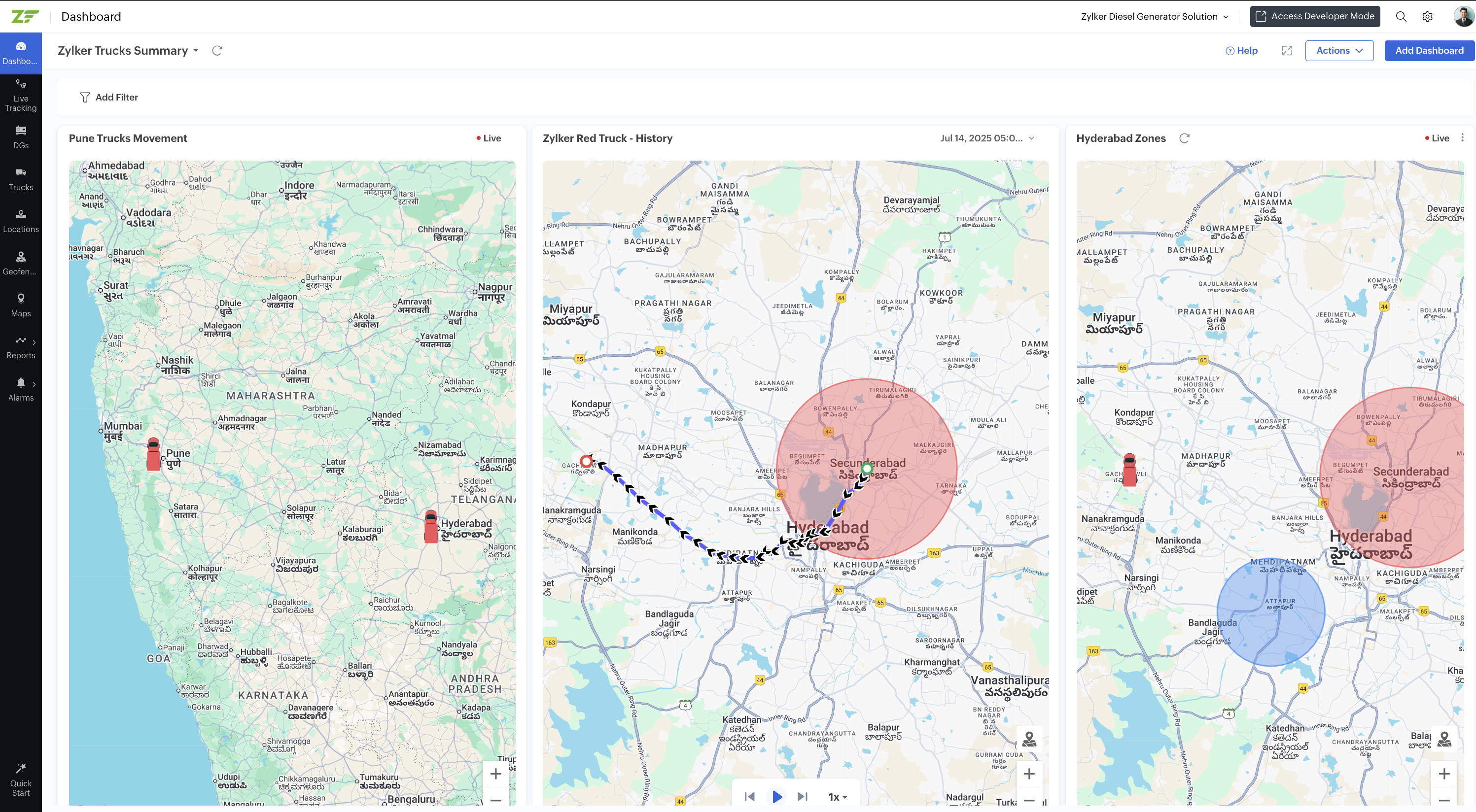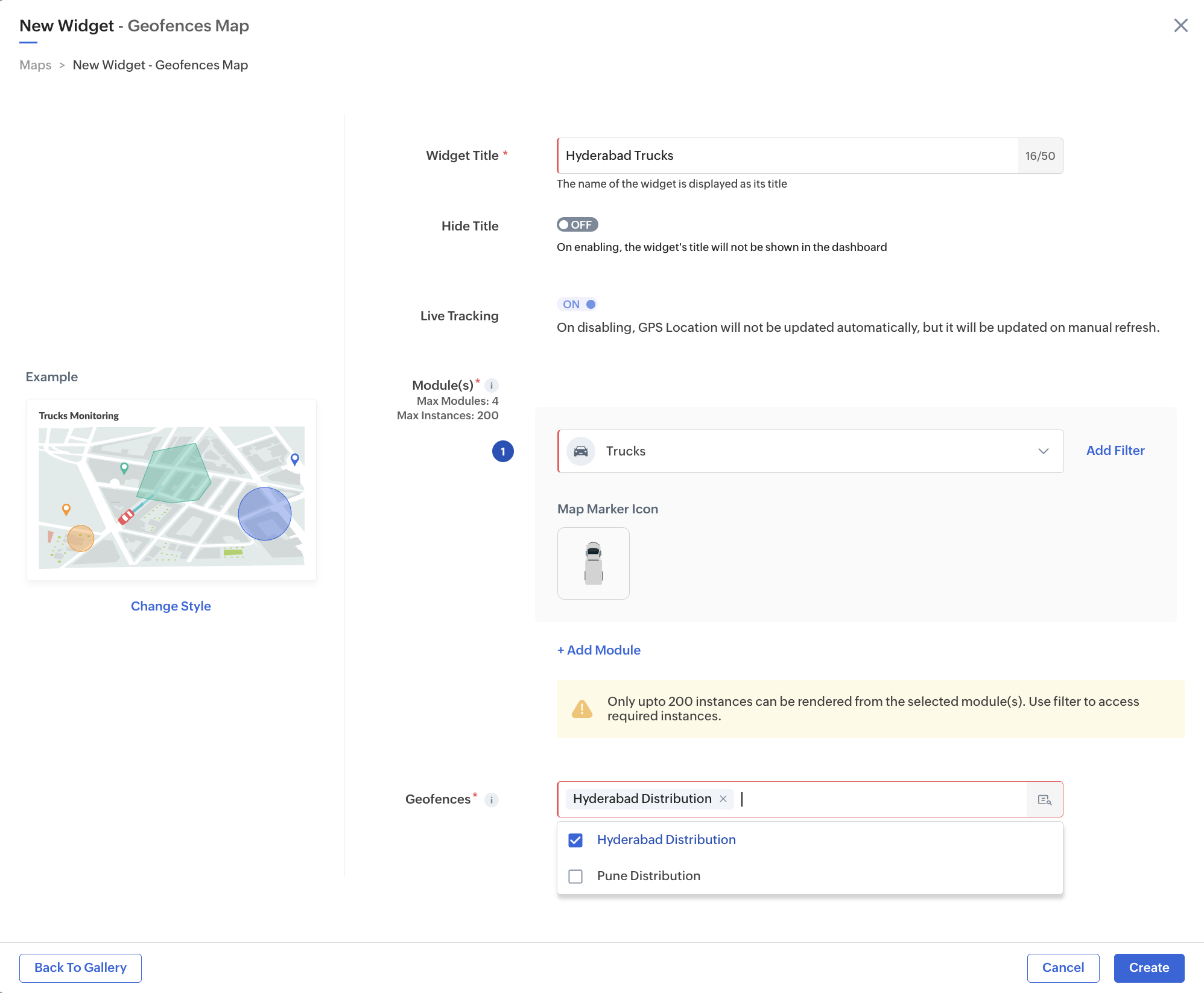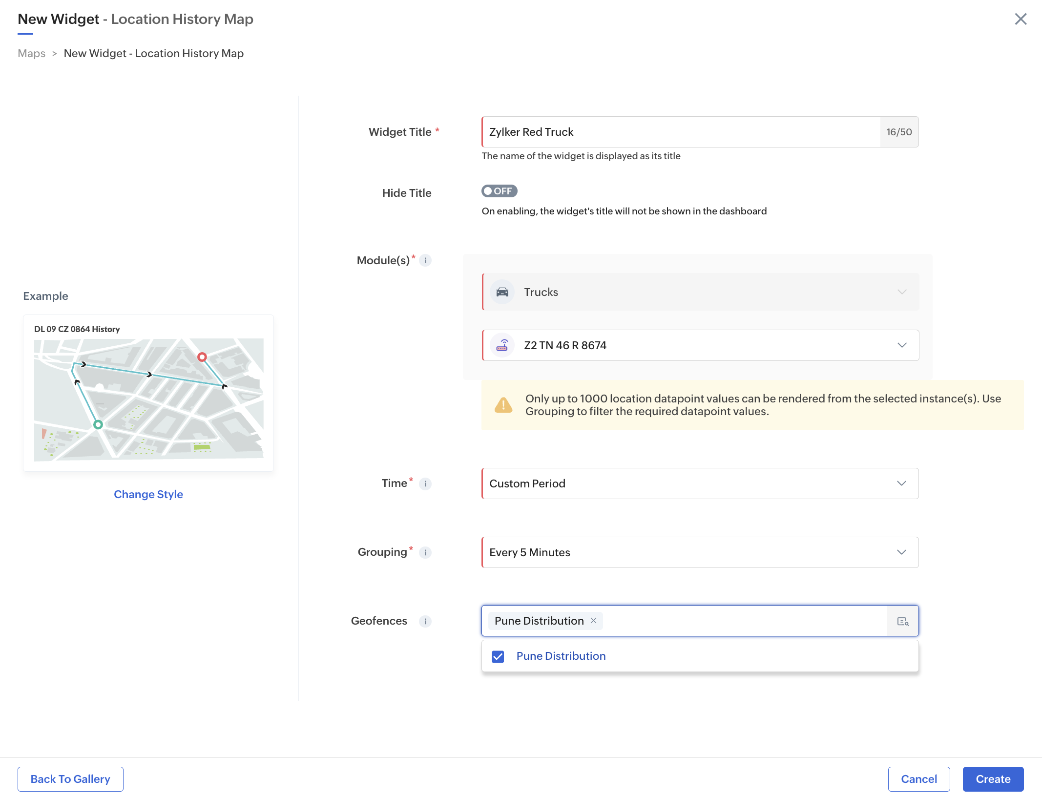 Note: The Location History Map widget and Geofences Map widget will be available only for Module Specific Dashboards.