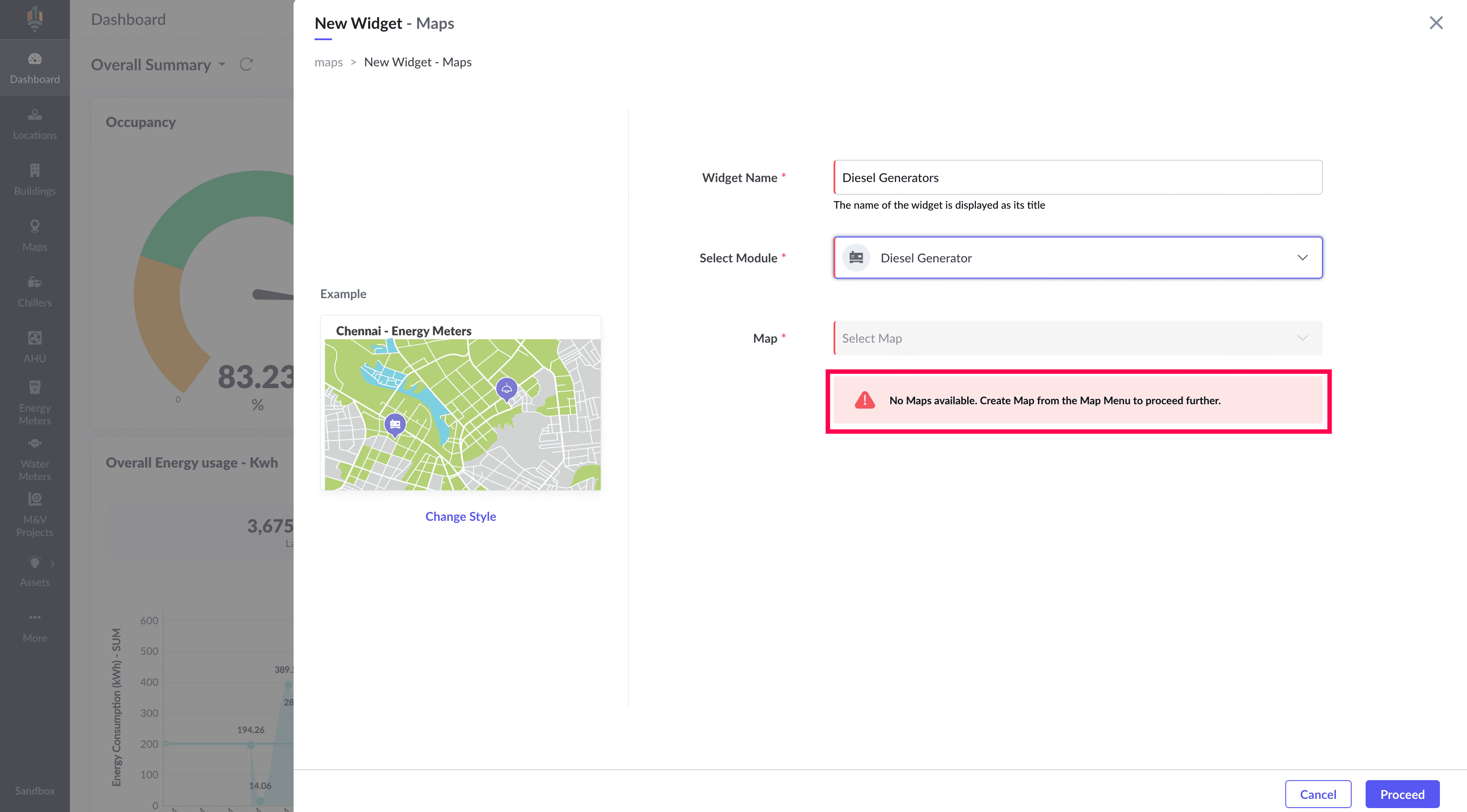 Note: The map must already exist for the module. Else the message "No Maps available. Create Map from the Map Menu to proceed further" will be displayed as shown below. You can create the map from the Map menu on the left, and later create the map widget.