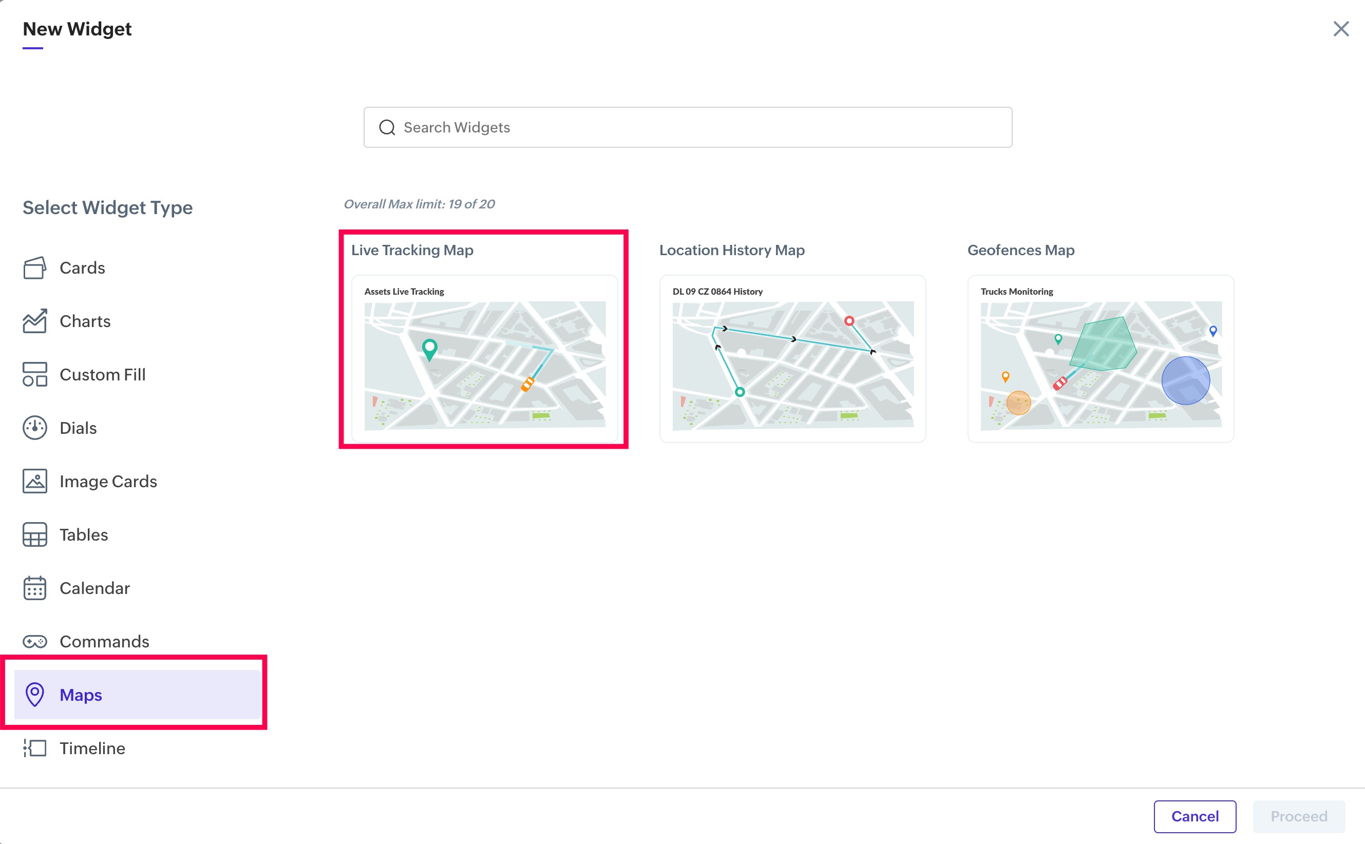 3. Select Maps from the type of widgets displayed, and select Live Tracking Map, then click Proceed.