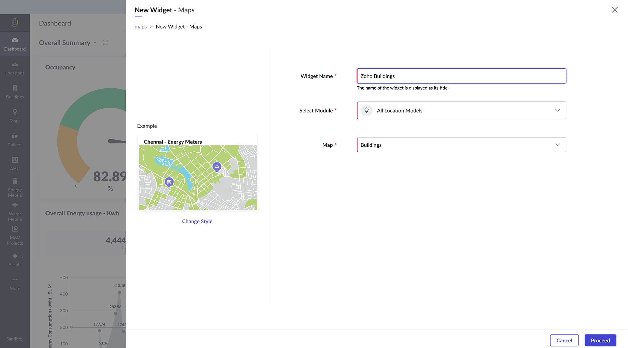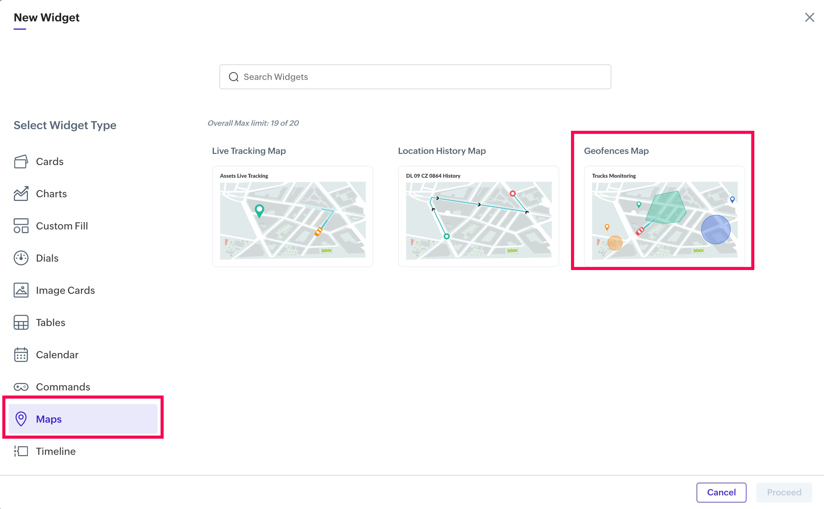3. Select Maps from the type of widgets displayed, and select Geofences Map, then click Proceed.