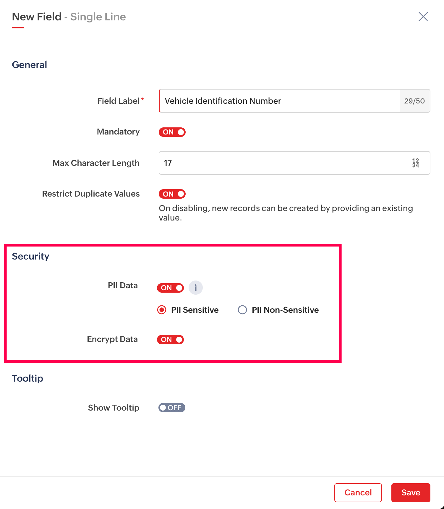 6. In the New Field form, select how you want to store your data based on its sensitivity under Security.