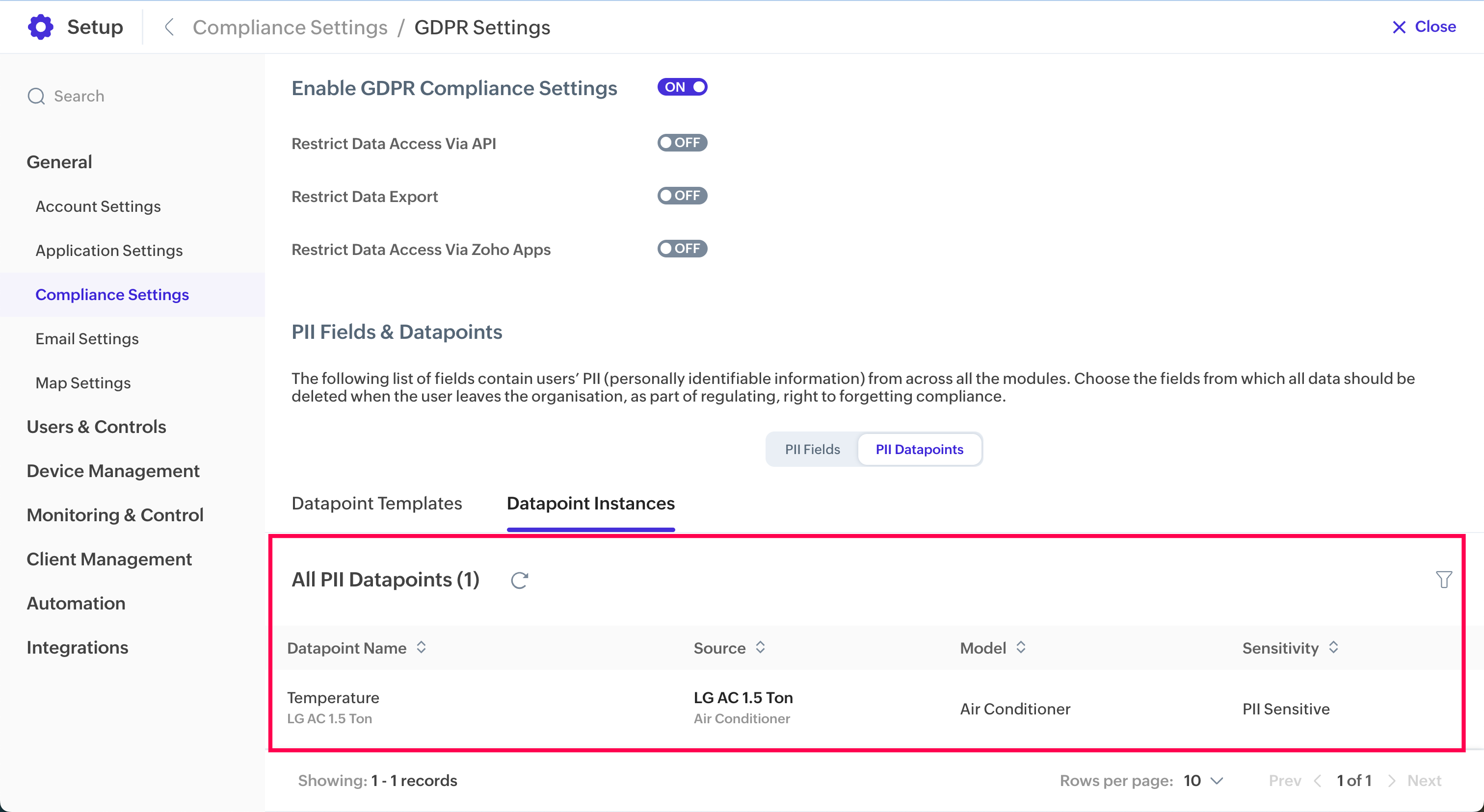 The Datapoint creation feature in Zoho IoT allows you to add datapoints to the application. You can choose to encrypt and save any of these datapoint values as Personally Identifiable Information (PII).