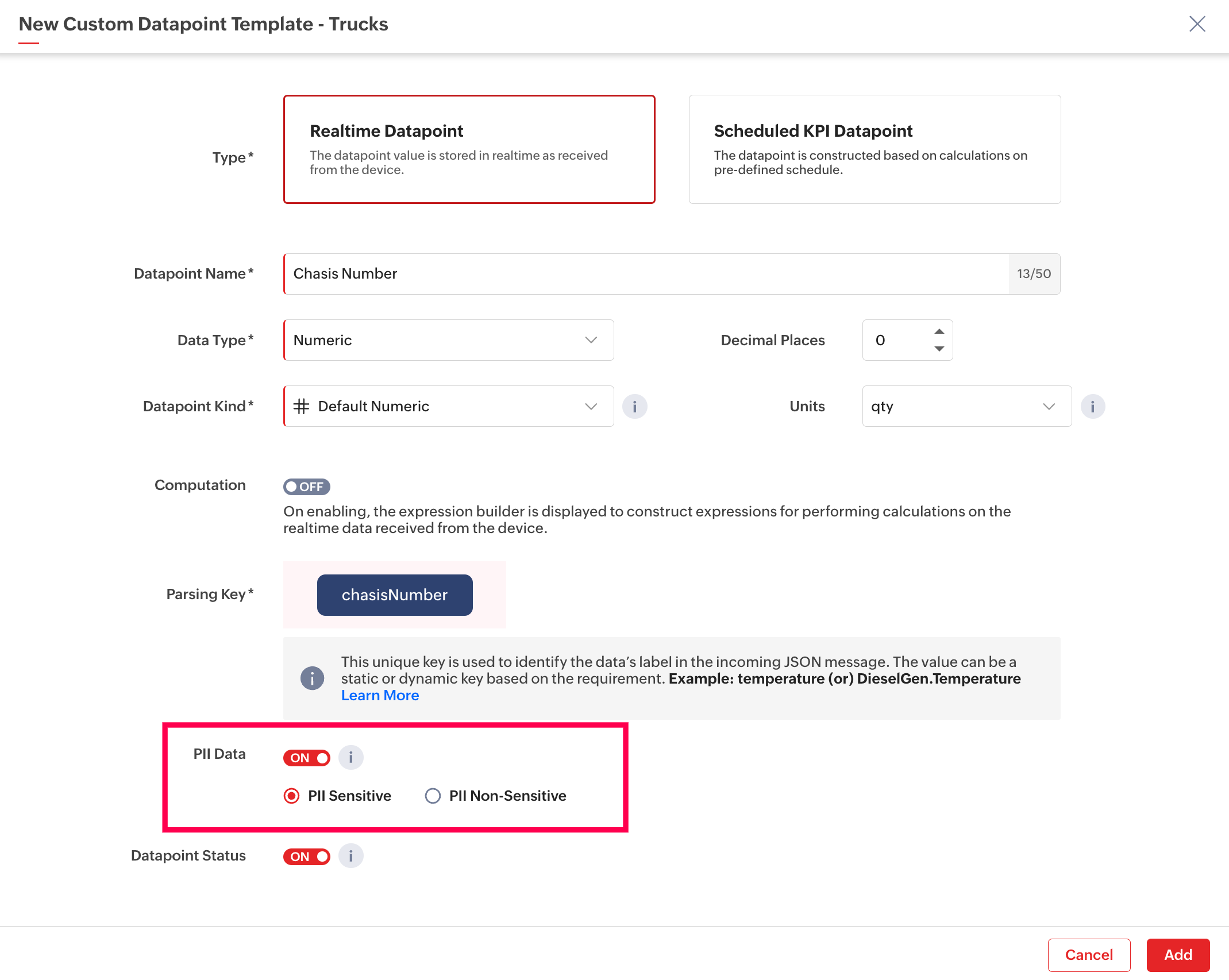 - Select PII Data (Personally Identifiable Information) if the information that you will enter is confidential and can be used to identify a person. You can mark datapoints such as Device Identification number, Driver license number, etc. as PII. You can choose to encrypt and store the data.