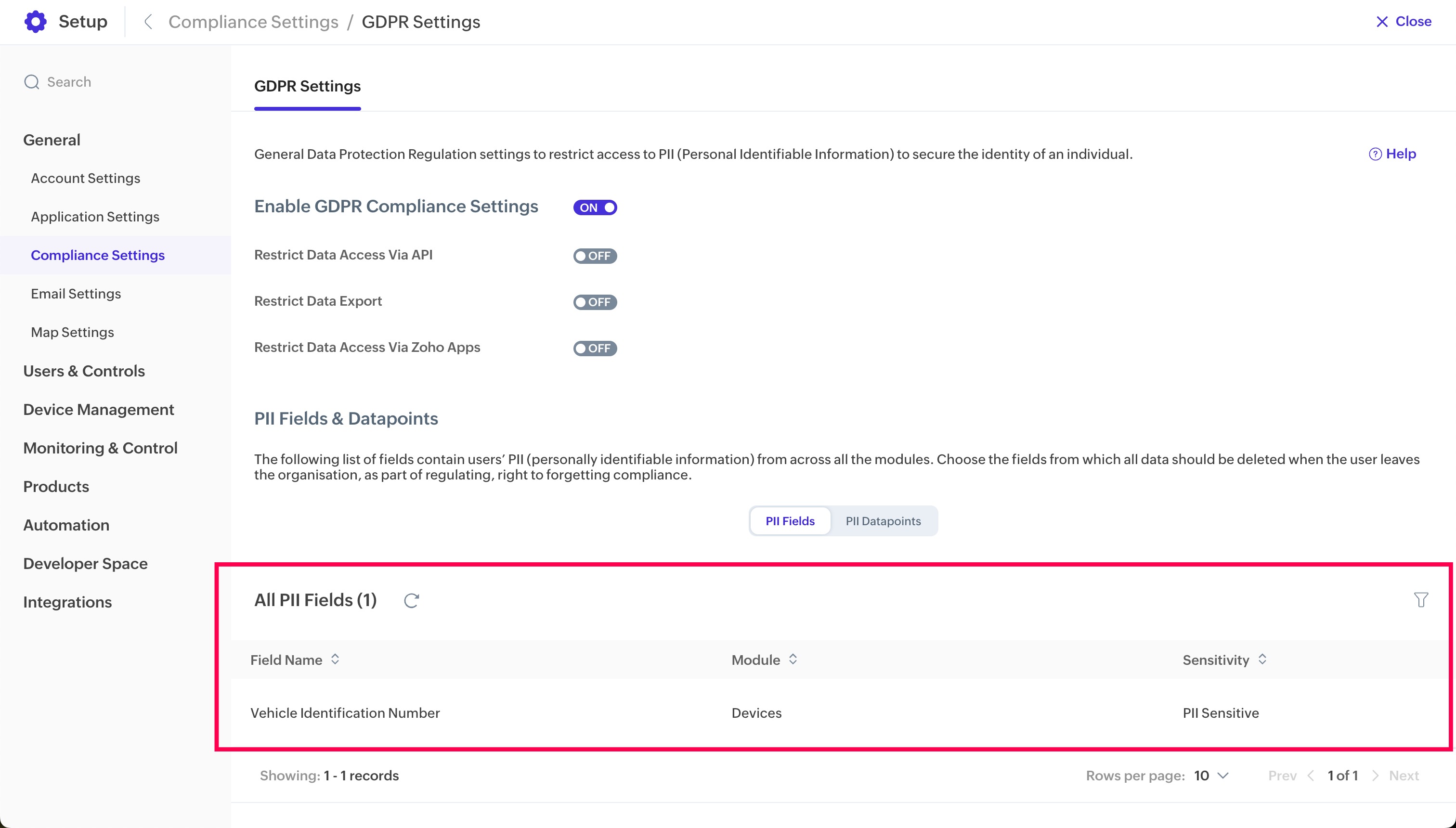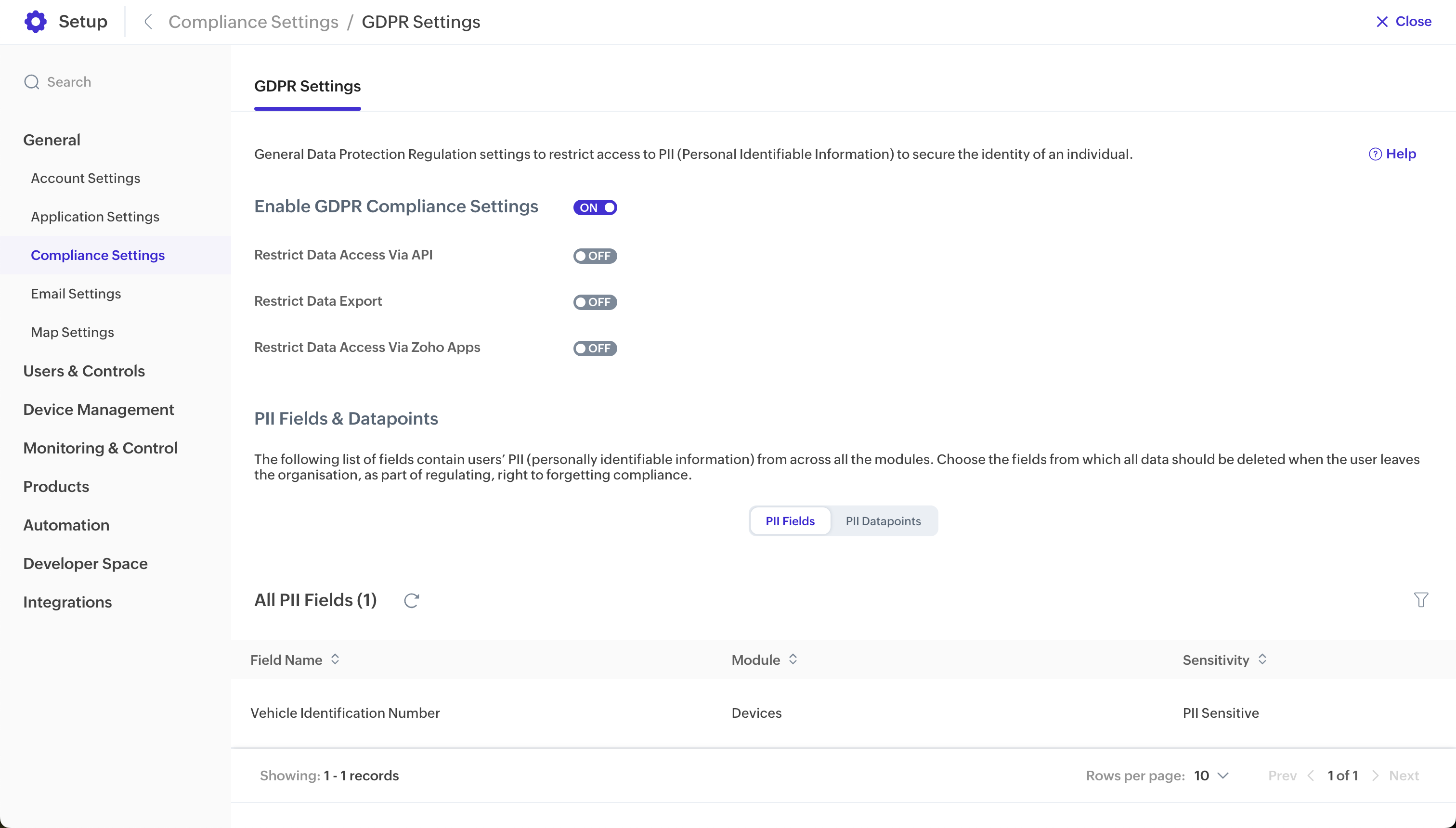 - Restrict Data Export - Application level restriction is possible for exporting any sensitive information. Once enabled, Personally Identifiable Information (PII) will not be able to export any sensitive information. This would include the device identification number, driver license number, financial information, etc.), and any custom fields created and marked as sensitive.