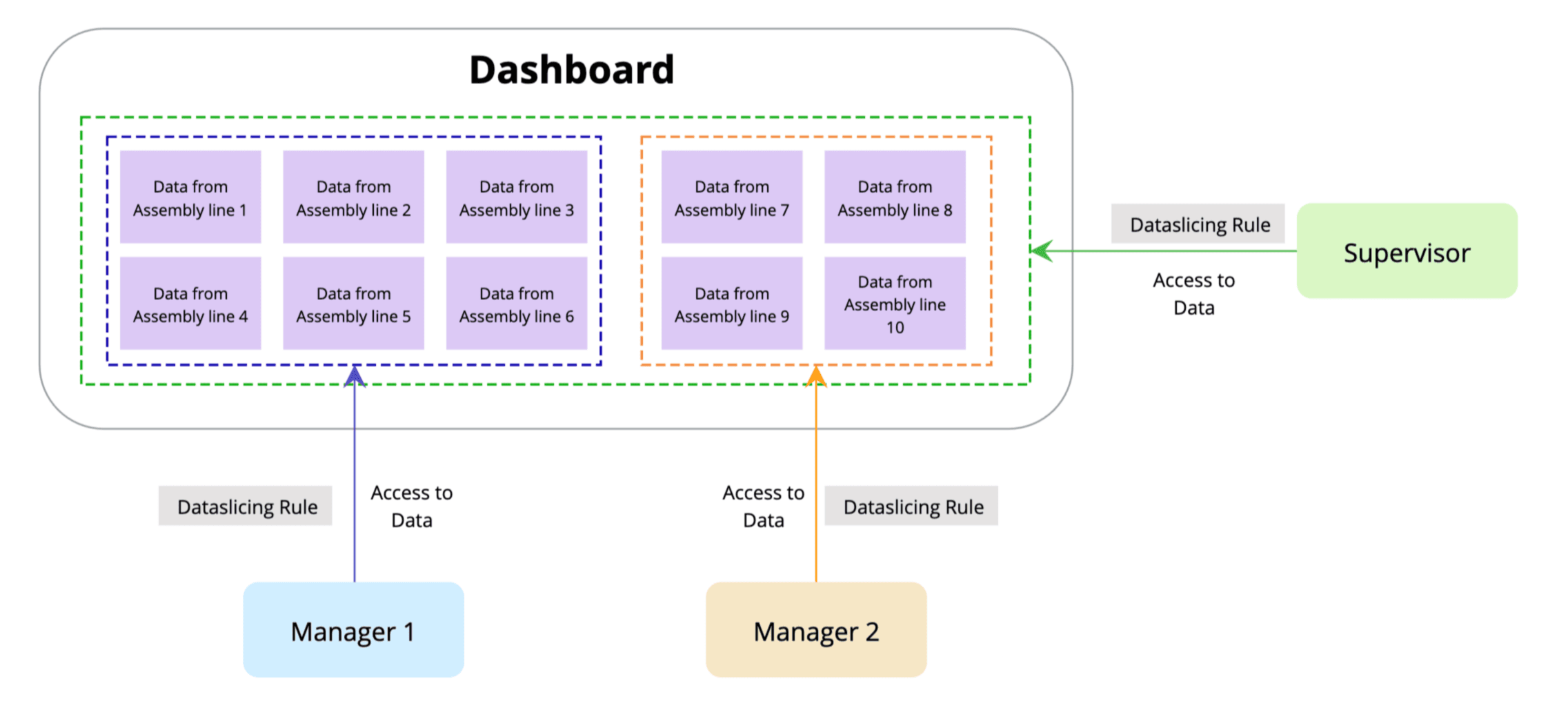 Consider a dashboard designed to monitor an industrial complex with 10 assembly lines. It features widgets that show data on energy consumption, product assembly, and defects produced. Three users: a manager and two supervisors have access to the dashboard. Data slicing rules enable the manager to view data from all assembly lines, while each supervisor can only see data from their assigned lines. Thus, the same dashboard displays different data depending on who is viewing it.