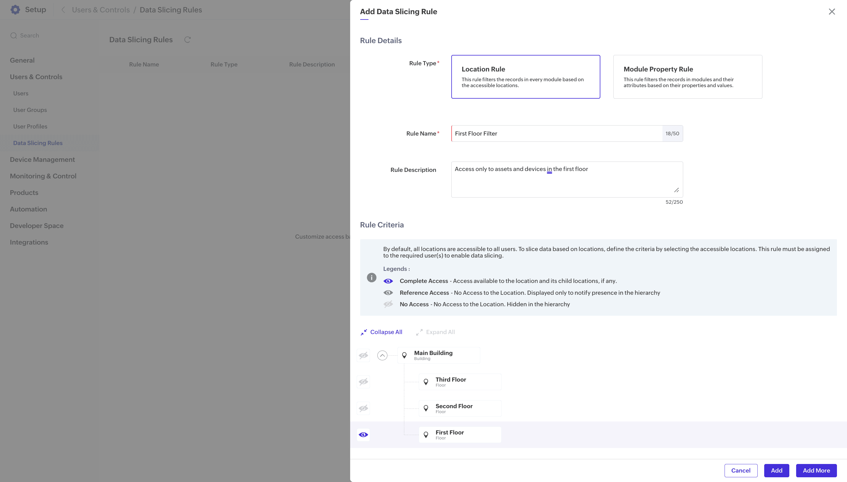 5. Provide the required details in the appropriate fields. For this illustration, a data slicing rule: First Floor Filter is created.