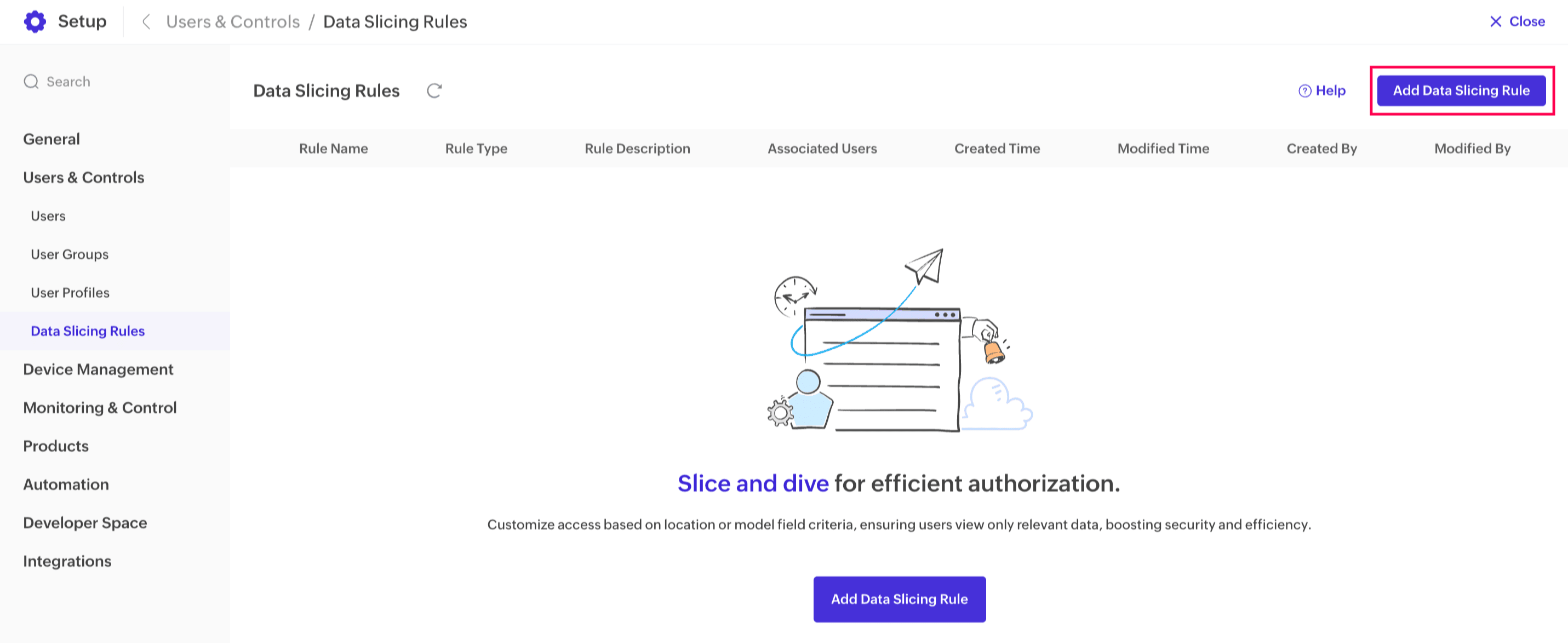 A data slicing rule can be associated with one or more users added in the application. To associate a data slicing rule with user(s), Access the End Application. Click the Settings icon in the top right corner. Click on Data Slicing Rules under the ...