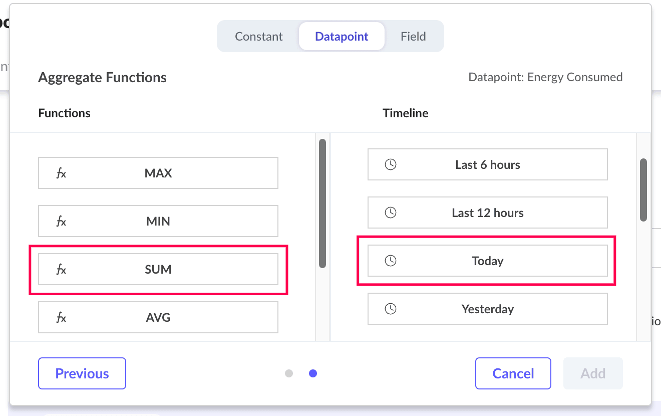 SUM | Summation of all the datapoint values aggregated over the set period. |