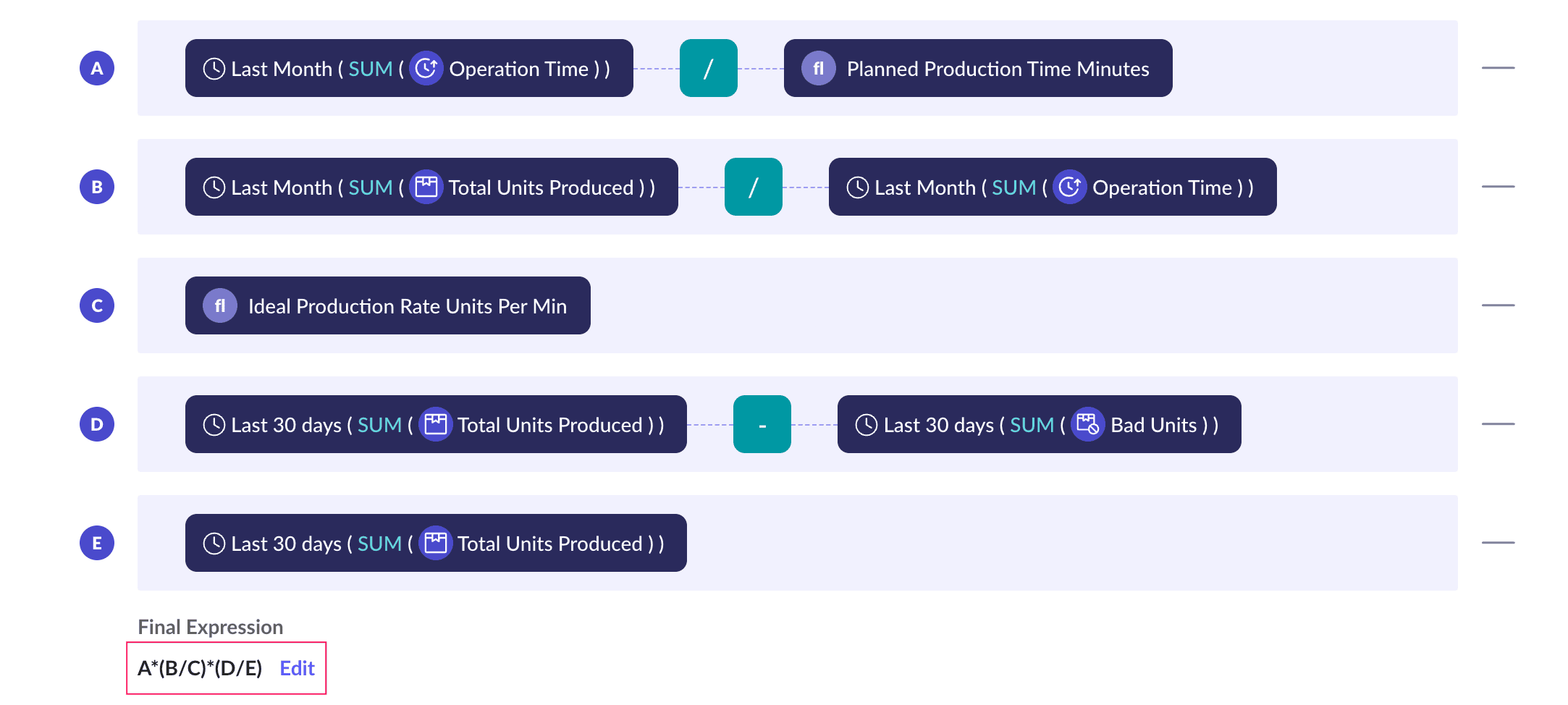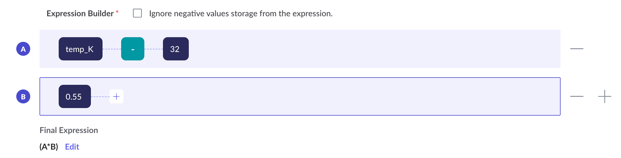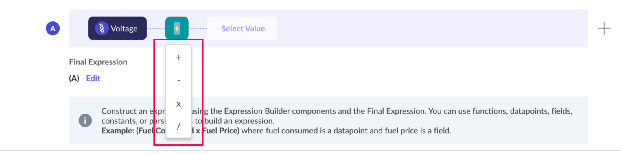 Expression builders are used to create expression for computing values based on a set of available datapoints, fields, or constants and storing them as realtime or scheduled KPI datapoints.