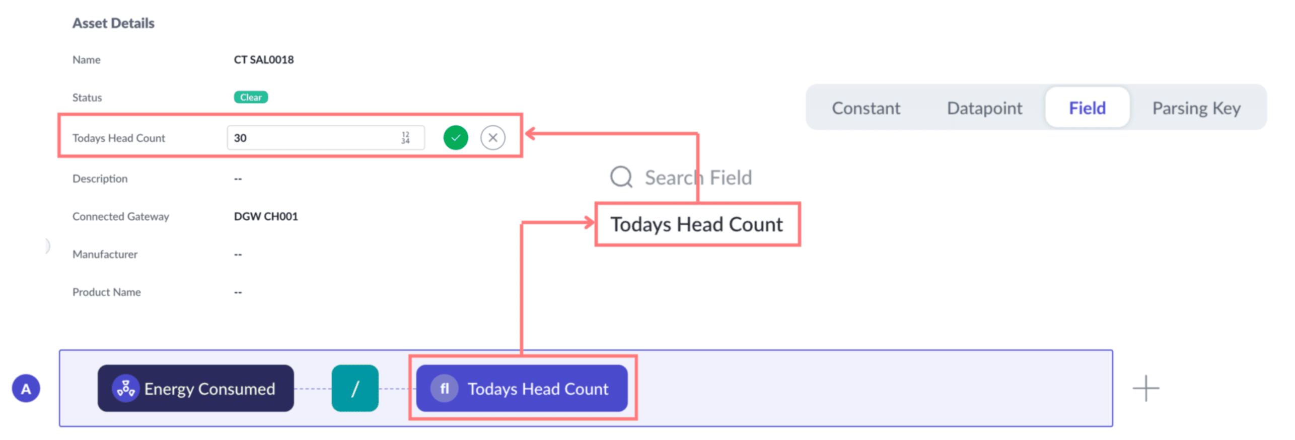For example, consider an expression used to calculate energy per person, where the daily count of people must be manually input. This data is entered into a field labelled "Today's Head Count."