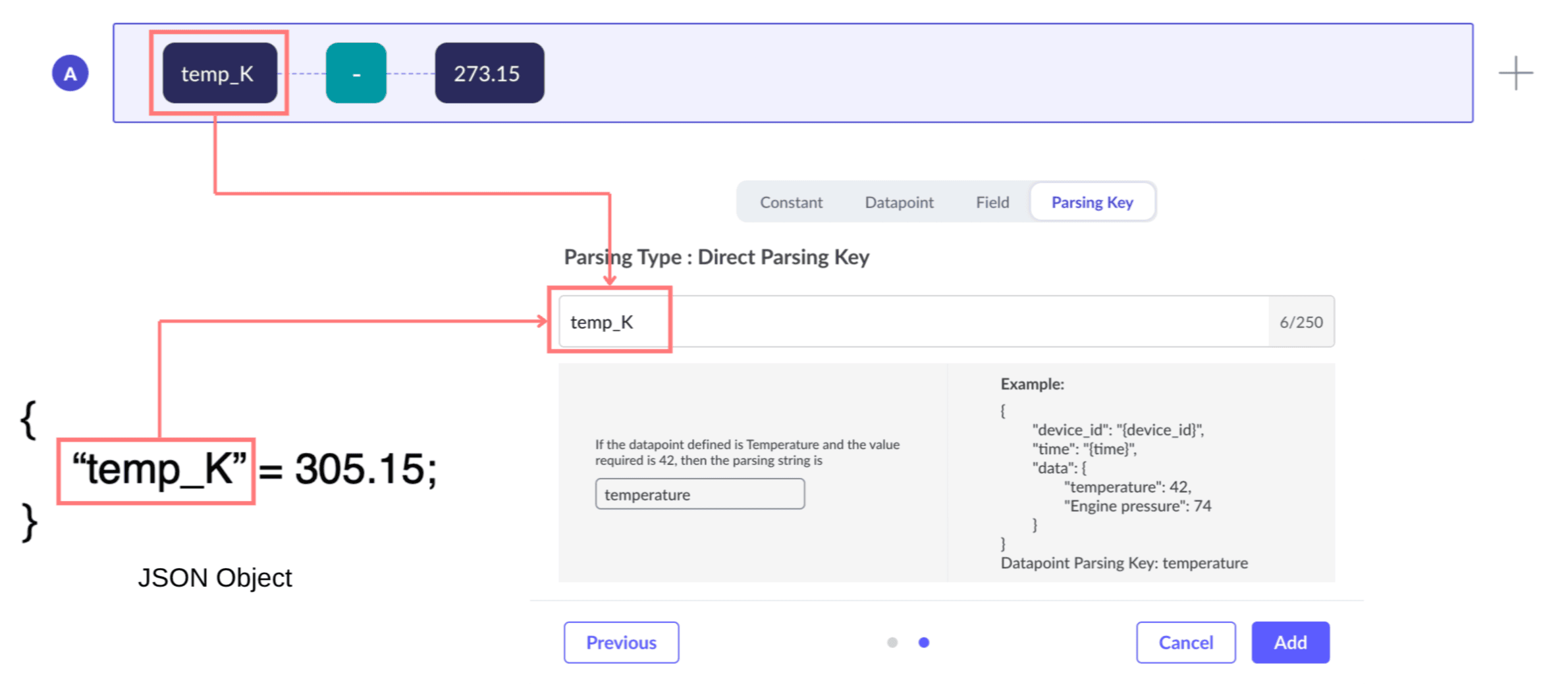 For example, consider a JSON payload where the temperature is sent in Kelvin, but you need a datapoint to store the value in Celsius. You can use the parsing key of the JSON object as a variable and then compute the value.