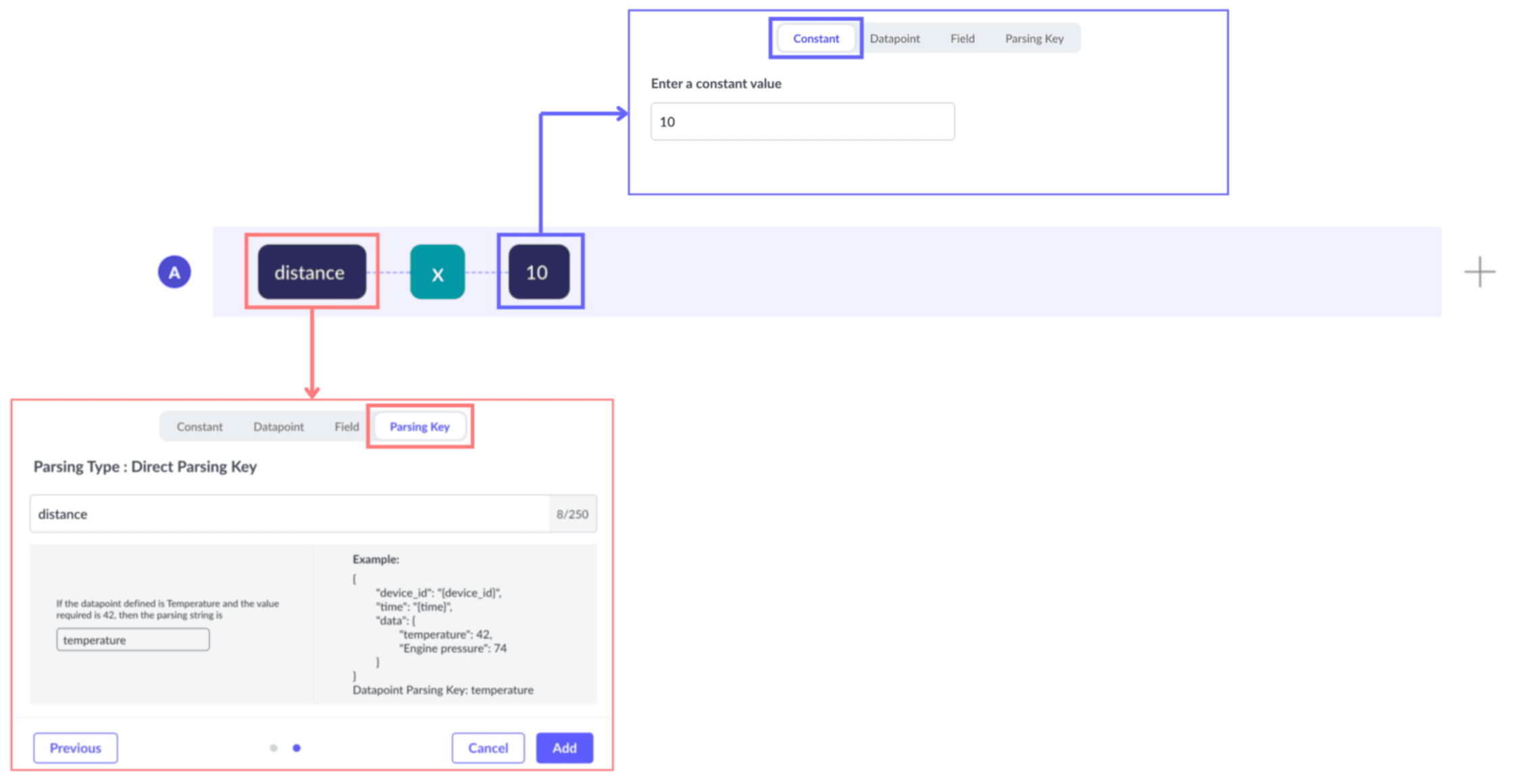 Variables: Variables hold the value to be used in the expression. A variable can be one of the four options: Constant, Datapoint, Field, Parsing Key.