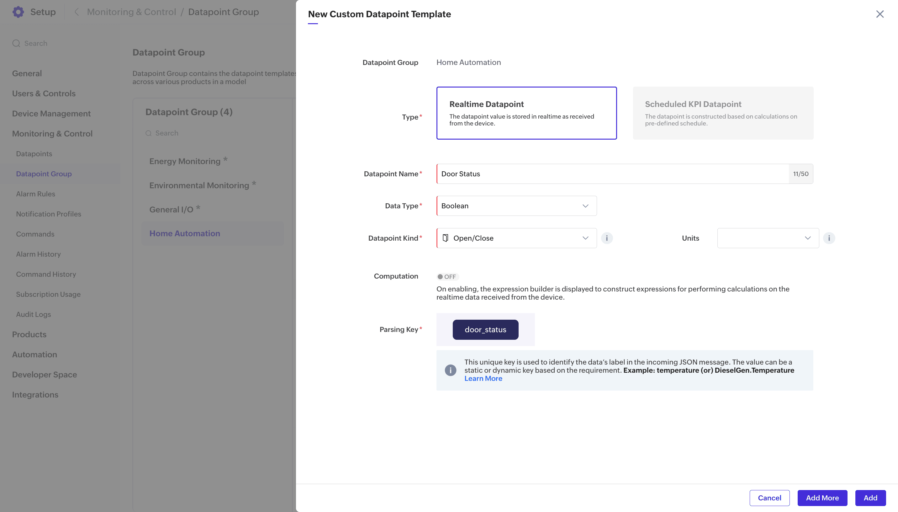 New realtime datapoint templates without computation can be added to a custom datapoint group which can be used while configuring device, asset, and location models.