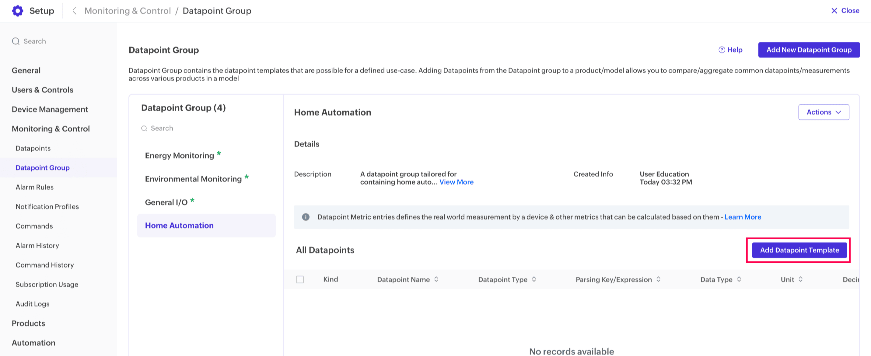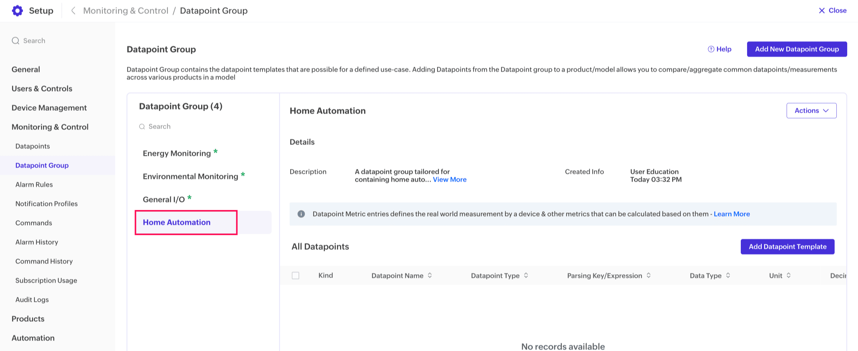 4. Click on the custom datapoint group for which you want to add the datapoint template. For this illustration, the Home Automation datapoint group is selected.