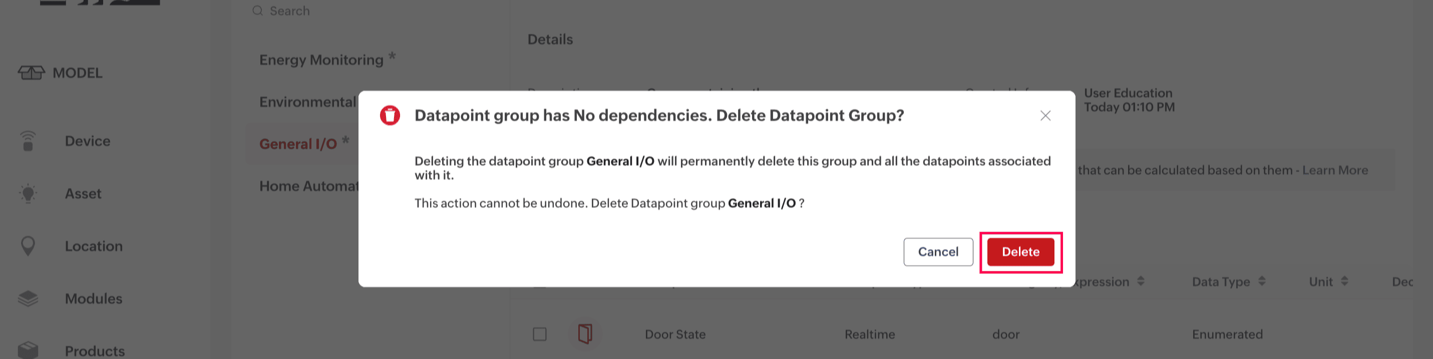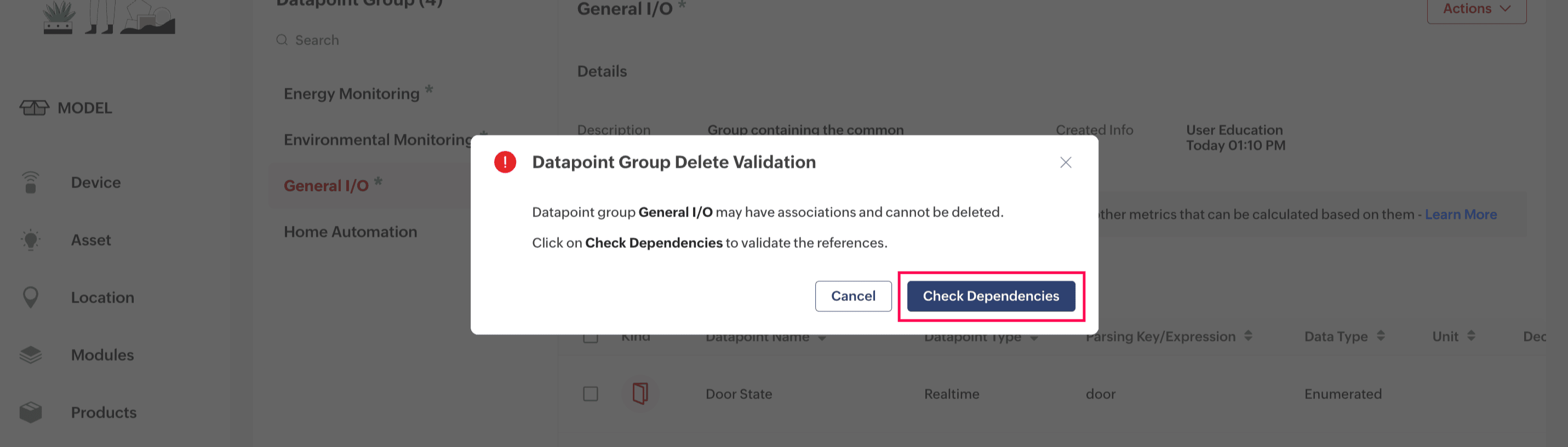 Delete Dependency: If any datapoint template in a datapoint group is imported in a product or utilised in configuring alarm rules template or other computational datapoint templates, it becomes a dependency for those elements. You must first remove them from the product they are associated with and the corresponding alarm rules template and computational datapoint templates using it. Only then can you delete the datapoint group.