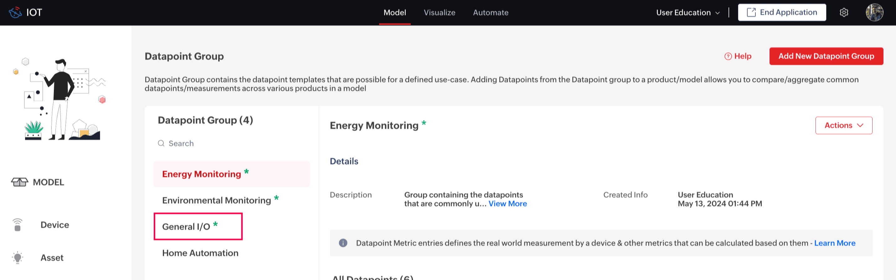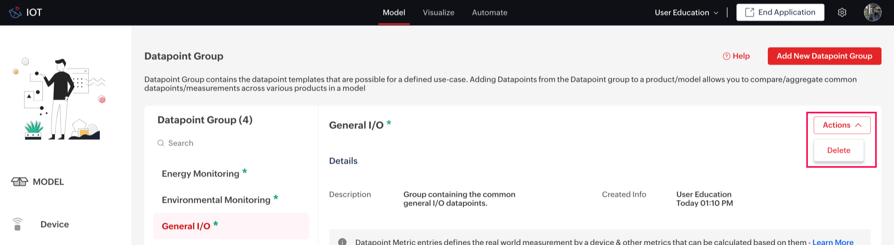 3. Select the datapoint group you want to delete. For this illustration, the datapoint group General I/O is selected.