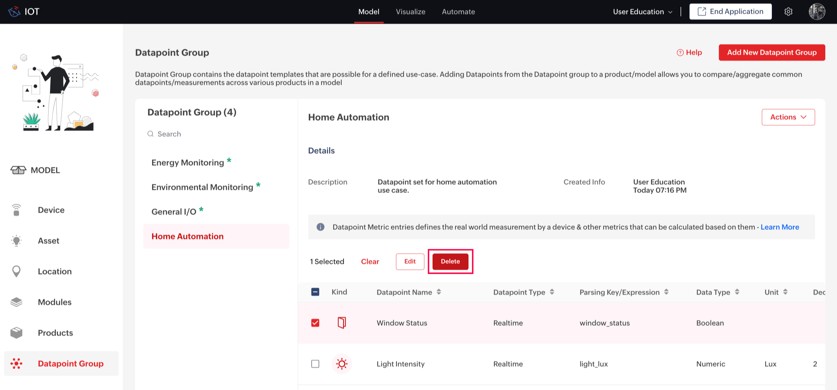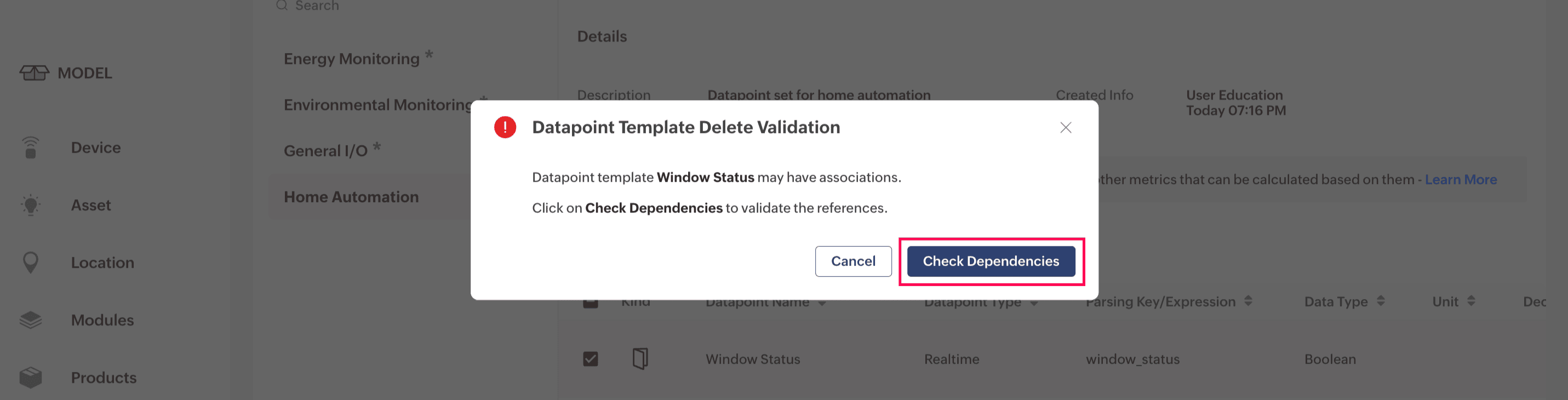 Datapoint groups added/imported to a Zoho IOT application can be removed. Delete Dependency: If any datapoint template in a datapoint group is imported in a product or utilised in configuring alarm rules template or other computational datapoint ...