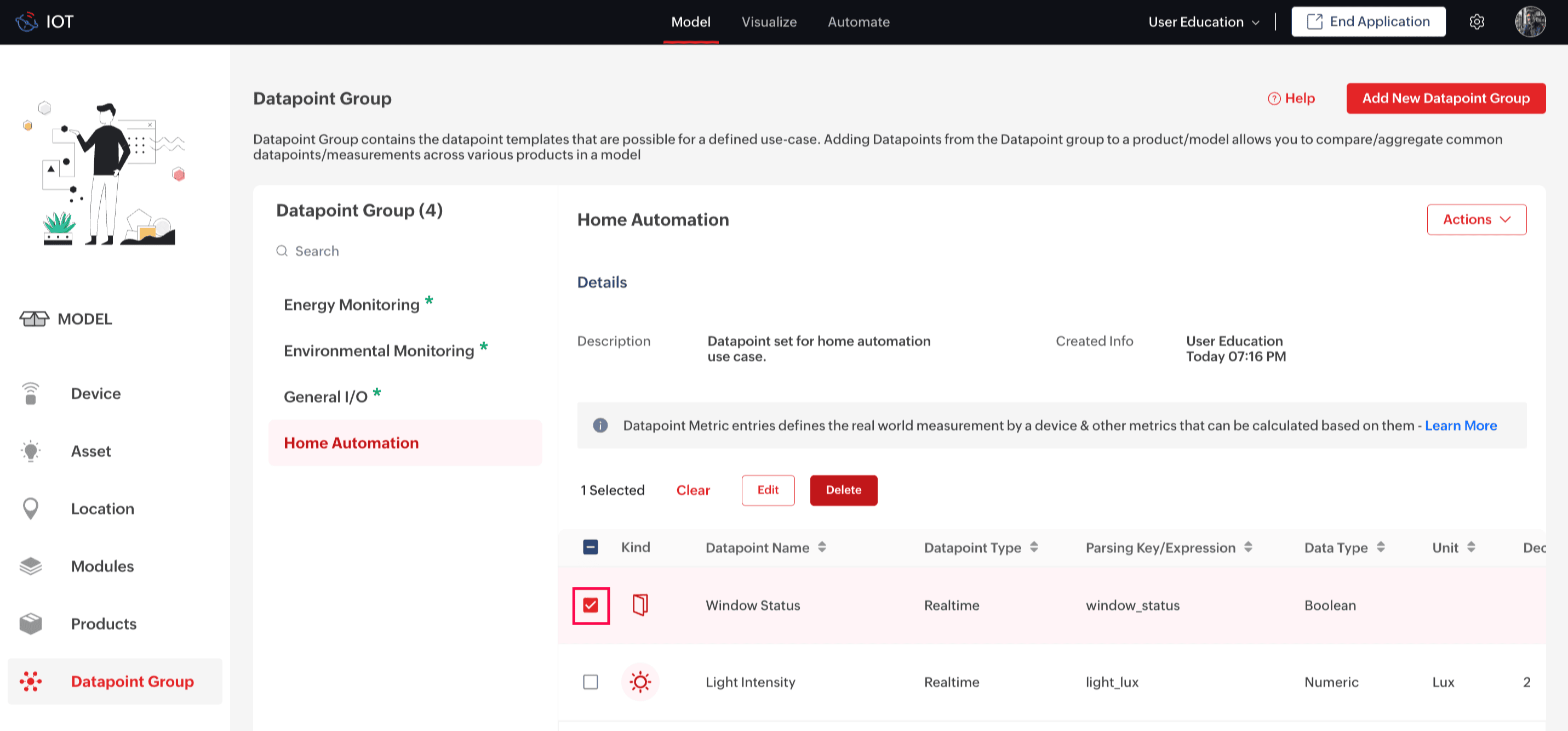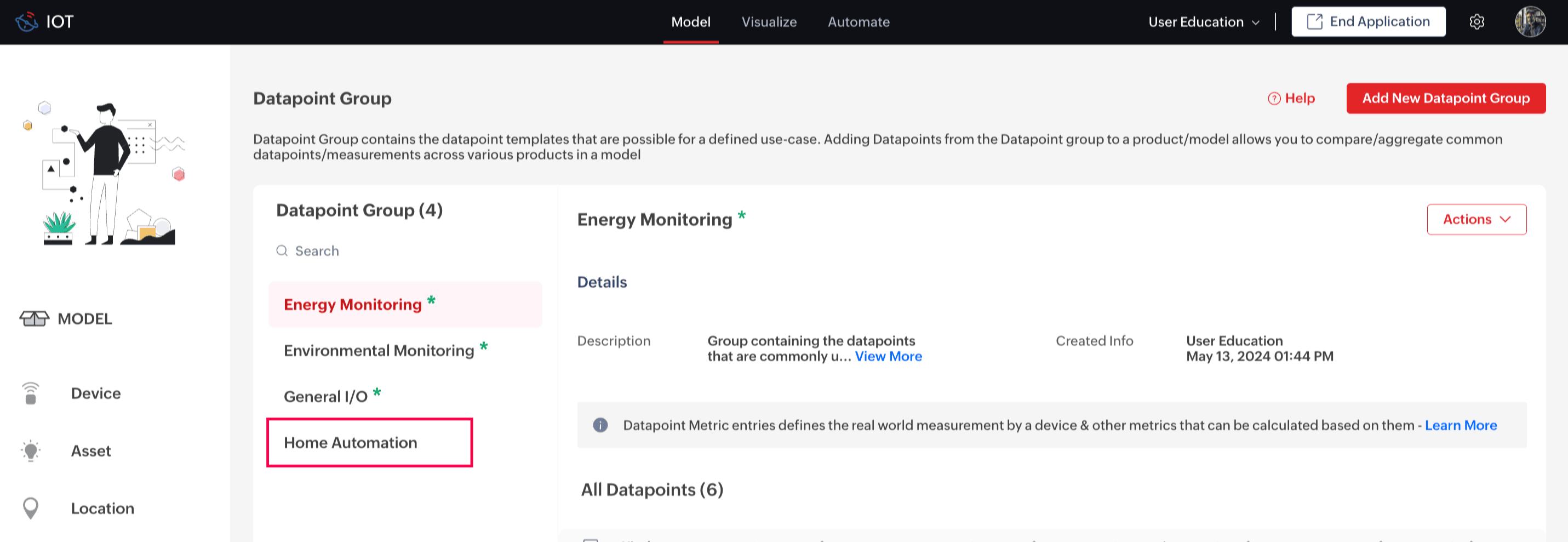 3. Select the datapoint group which has the datapoint template you want to edit. For this illustration, the datapoint group Home Automation is selected.