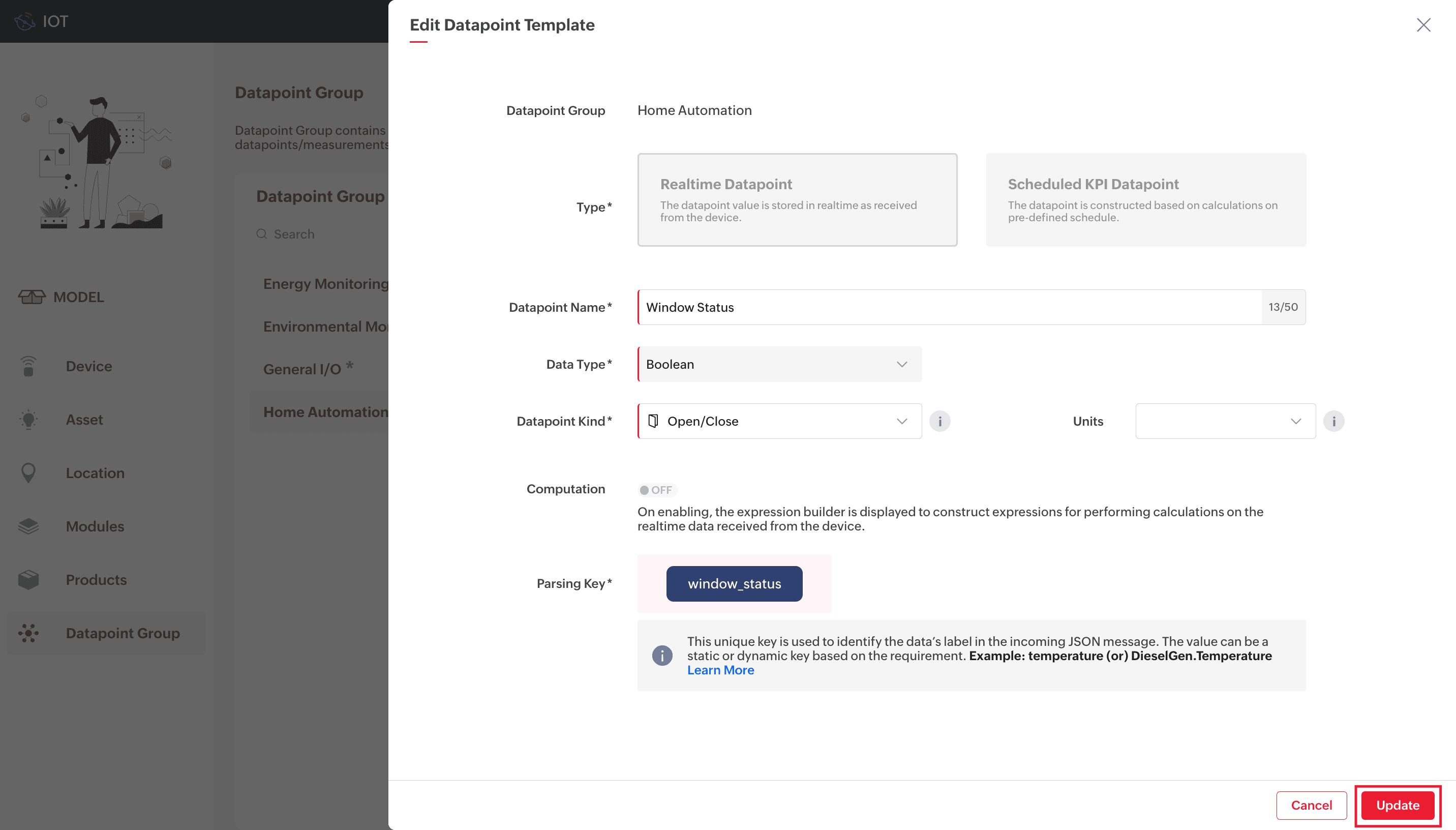 Note: For datapoint templates of datapoint groups imported from the gallery, only the parsing key can be edited. However, for the datapoint templates in a custom datapoint group the name, datapoint kind, and parsing key can be modified.