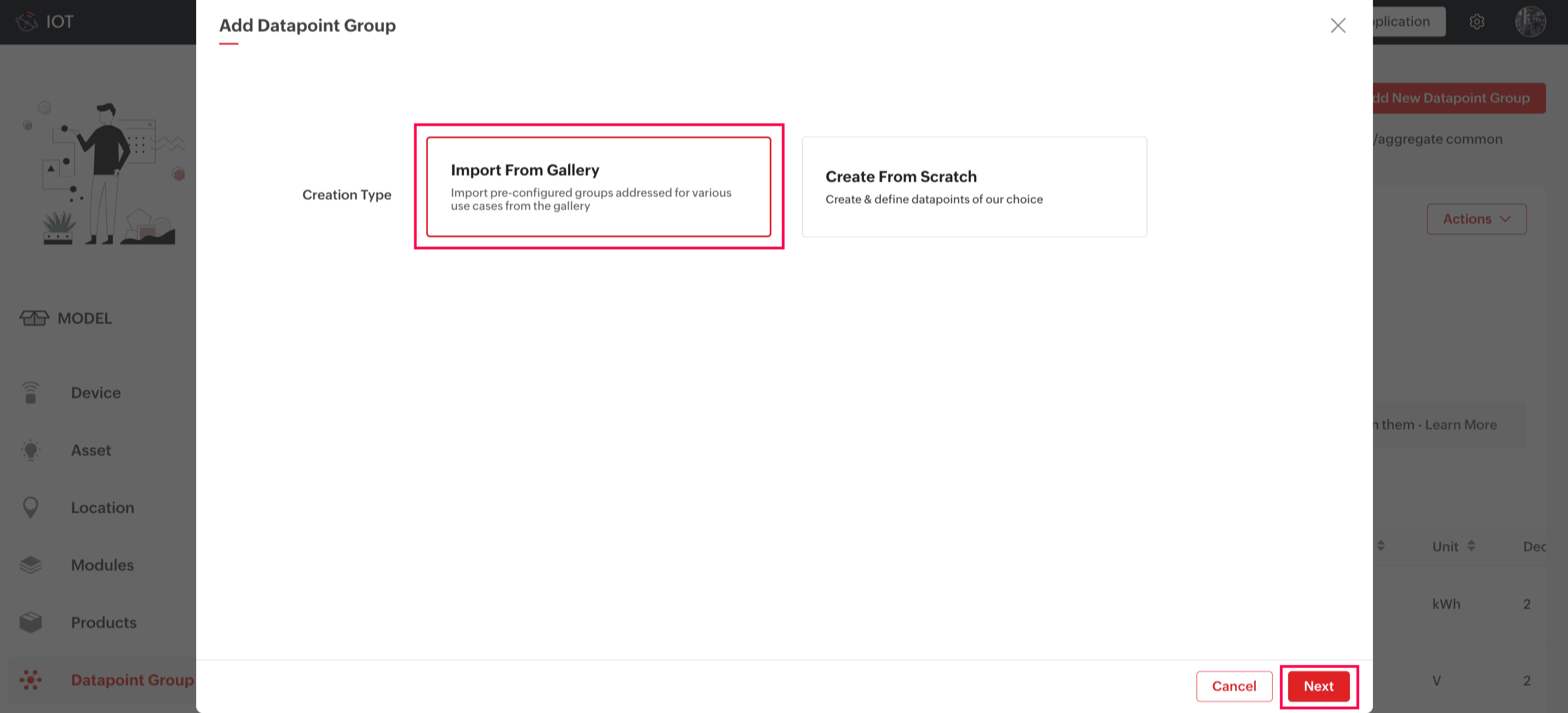 Datapoint templates for a Device model, Asset model, or Location model can be imported directly from predefined datapoint groups. Note: Only Realtime Datapoints without any computation are available in datapoint groups and can be imported. If you ...