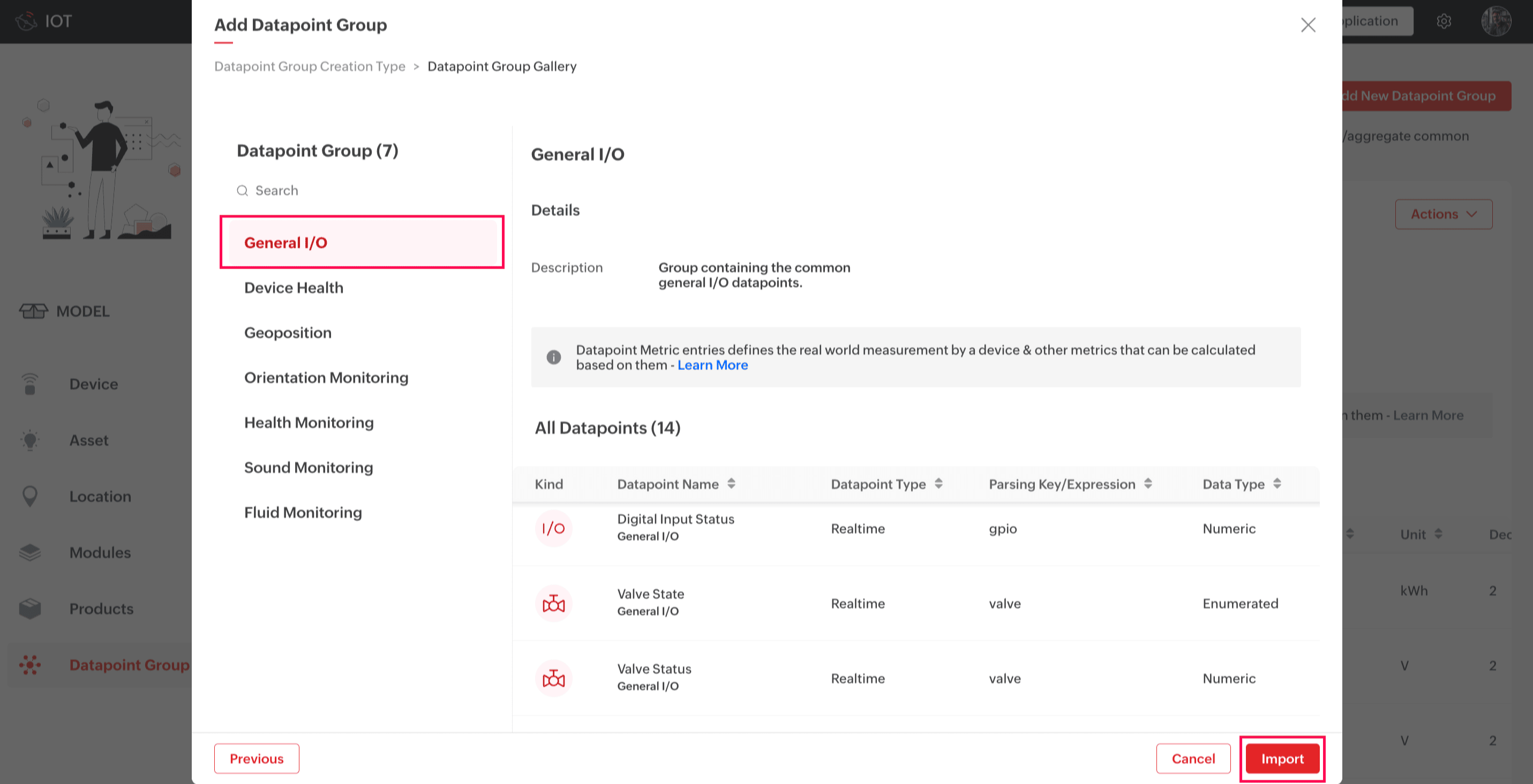 5. Select the datapoint group you want to add in the left pane and click Import. The datapoint templates configured for the selected group will be displayed on the right. For this illustration, the datapoint group General I/O is selected.
