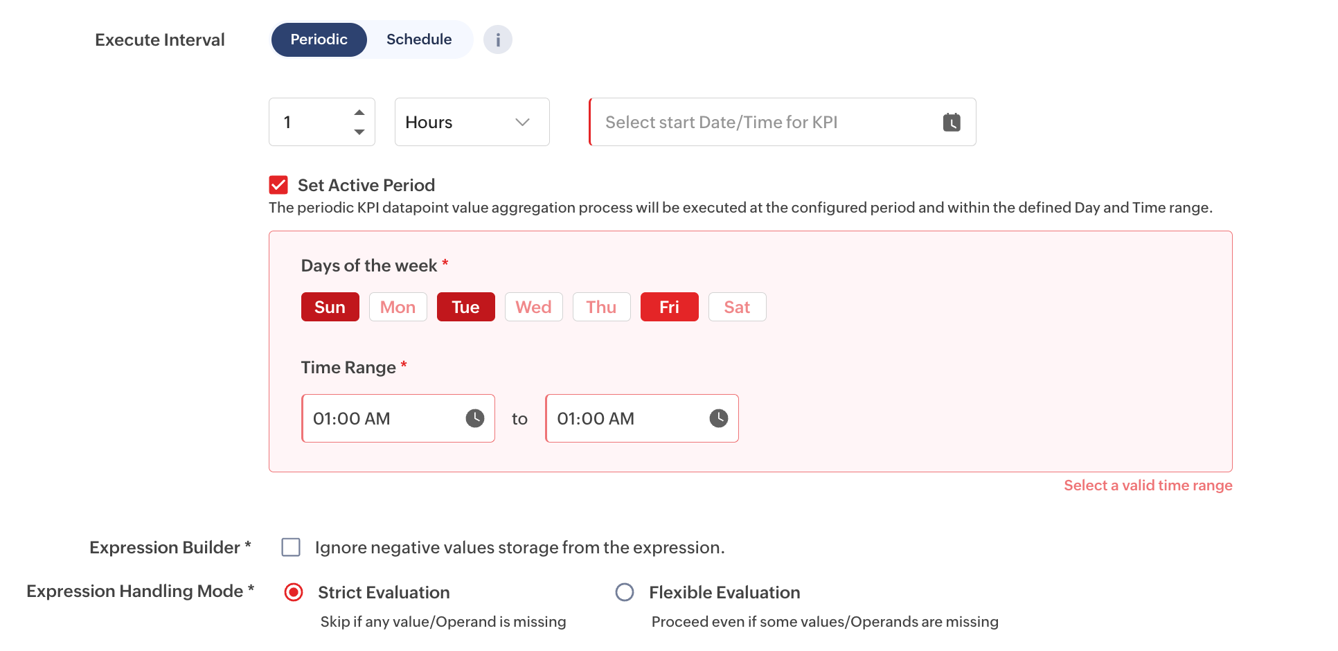 Execute Interval | Defines when the KPI datapoint is executed and its value calculated. Periodic: Executes the KPI datapoint at fixed intervals, where the interval is defined in hours or days. Set Active Period: The KPI datapoint is executed only during the defined active period and follows the configured execution interval. Days of the Week: Specifies the days on which the KPI datapoint needs to be. Time Range: Defines the time window during which the KPI datapoint is allowed to execute on the selected days. | Periodic Example: If the execution interval is set to 1 Hour and the start date and time is 01-Aug-2024, 09:00 AM, the KPI datapoint is first calculated at 9:00 AM on August 1st and then repeats every hour thereafter. Set Active Period Example: If the execution interval is set to 1 Hour and the active period is configured from 9:00 AM to 6:00 PM on Monday, Wednesday, and Friday, the KPI datapoint is calculated at 9:00 AM, 10:00 AM, 11:00 AM, and so on, until 6:00 PM, only on the selected days. |