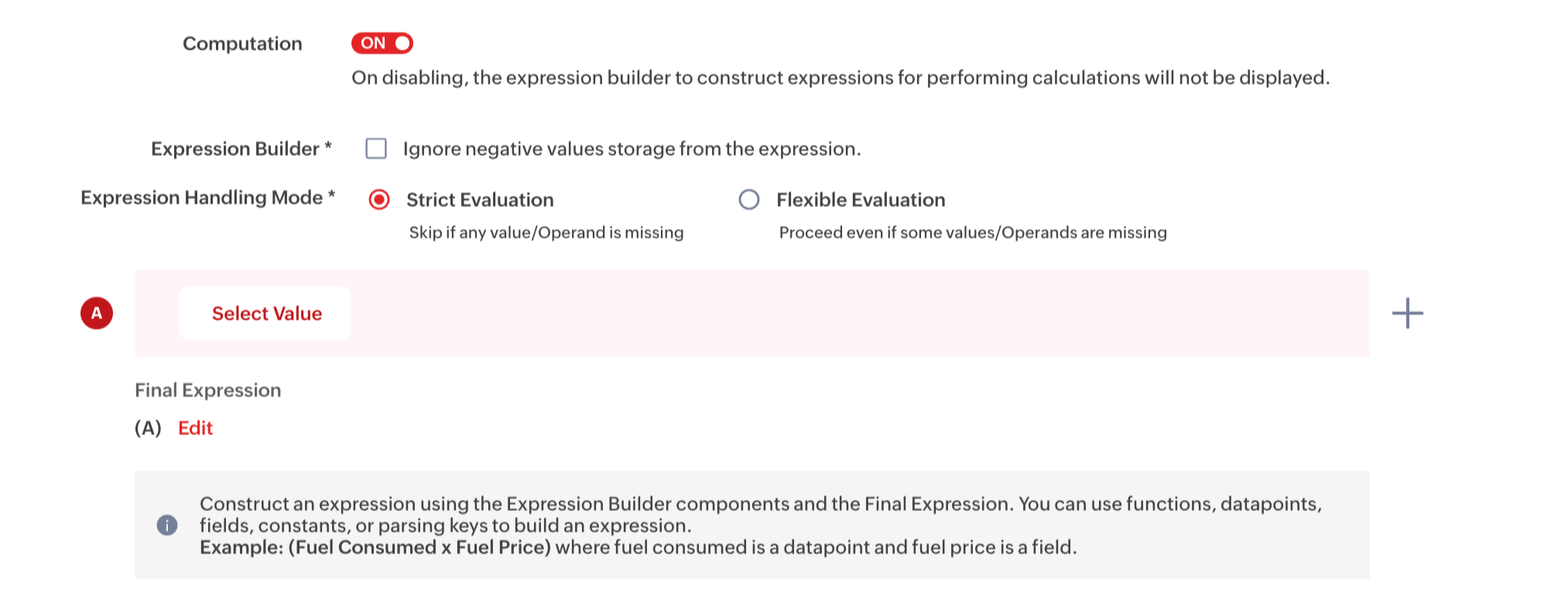 Expression Handling Mode | Controls how the system evaluates expressions when one or more input values are missing. Strict Evaluation: The expression is skipped if any required value or operand is missing and no value is stored. Flexible Evaluation: The expression is evaluated even if some values or operands are missing. Missing values are treated as 0. If the evaluation results in an invalid value, the result is not stored. If the evaluation produces a valid numeric value, it is stored. | Strict Evaluation Example: In the expression, energy + standby_power. If standby_power is missing, the expression is not evaluated and no value is stored for the datapoint. Flexible Evaluation Example: 1. Consider the expression, energy / runtime. If runtime value is missing, it is treated as 0. The expression results in infinity or an invalid value. In this case, the computed value is not stored. 2. Consider the expression, energy + standby_power. If standby_power is missing, it is treated as 0. The expression is still evaluated, and the resulting value is stored if it is a valid number. |