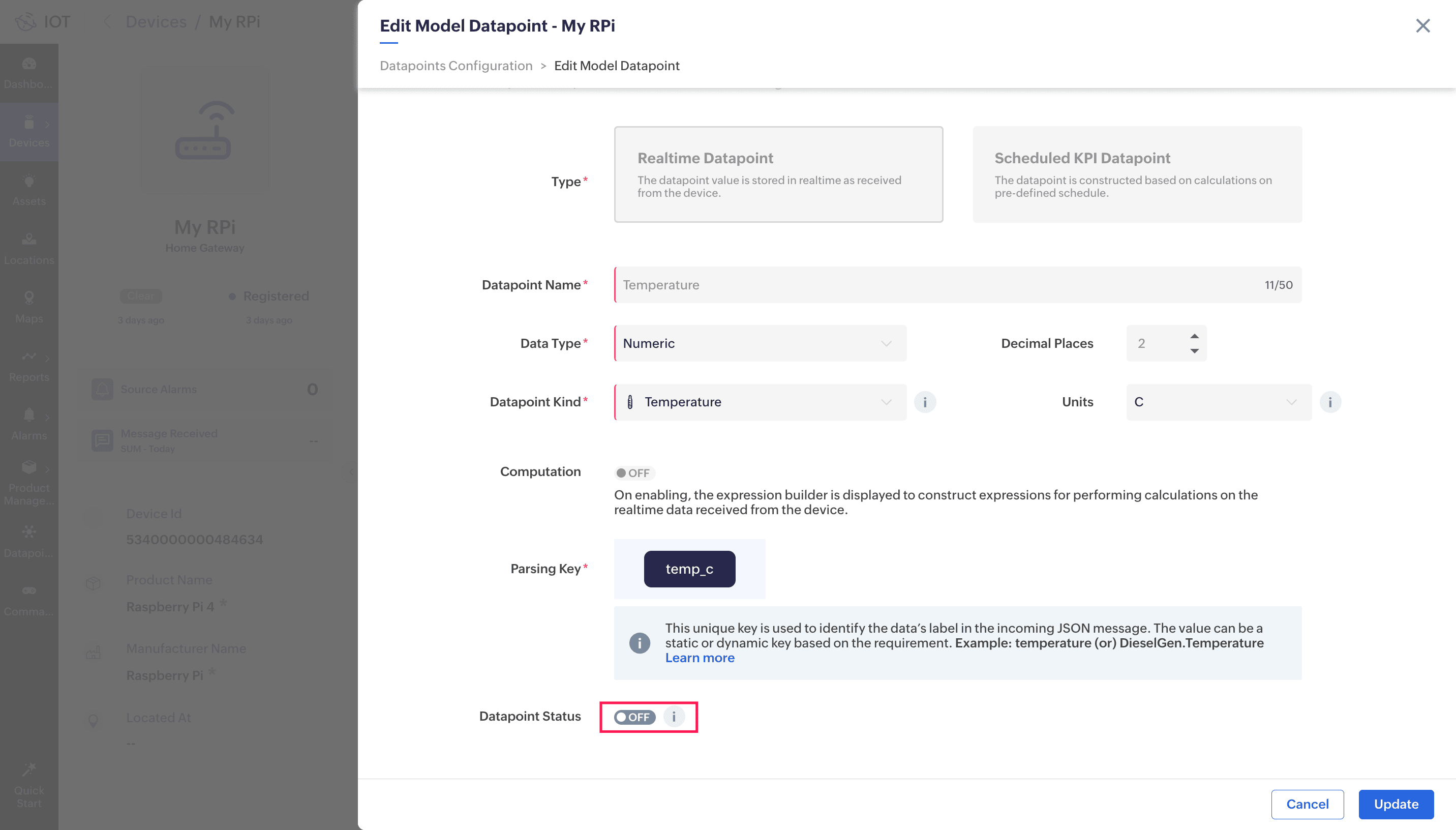 You can modify the parsing key and datapoint status of any datapoint in a device, asset, or location by editing a datapoint in the end application. All Datapoint operations require necessary permissions. Refer User Profiles document for more details. ...