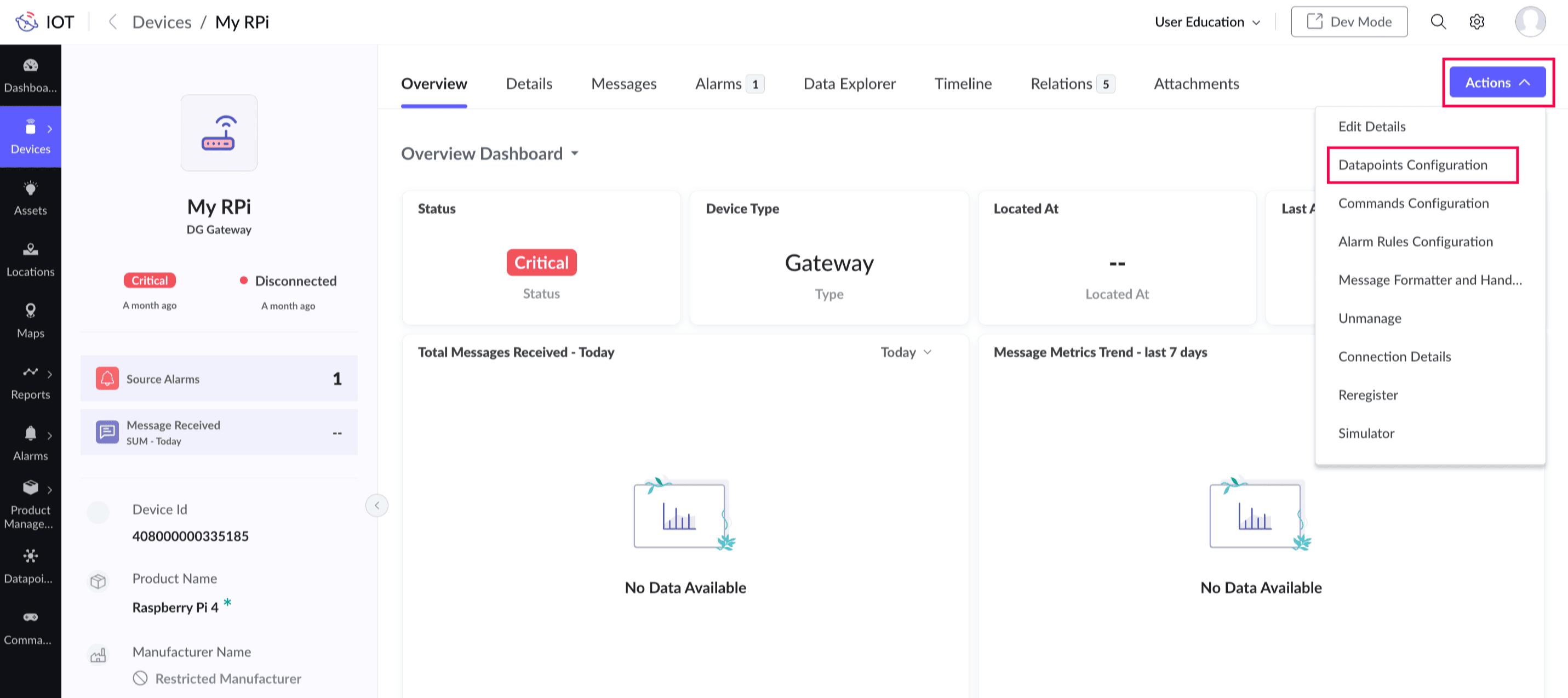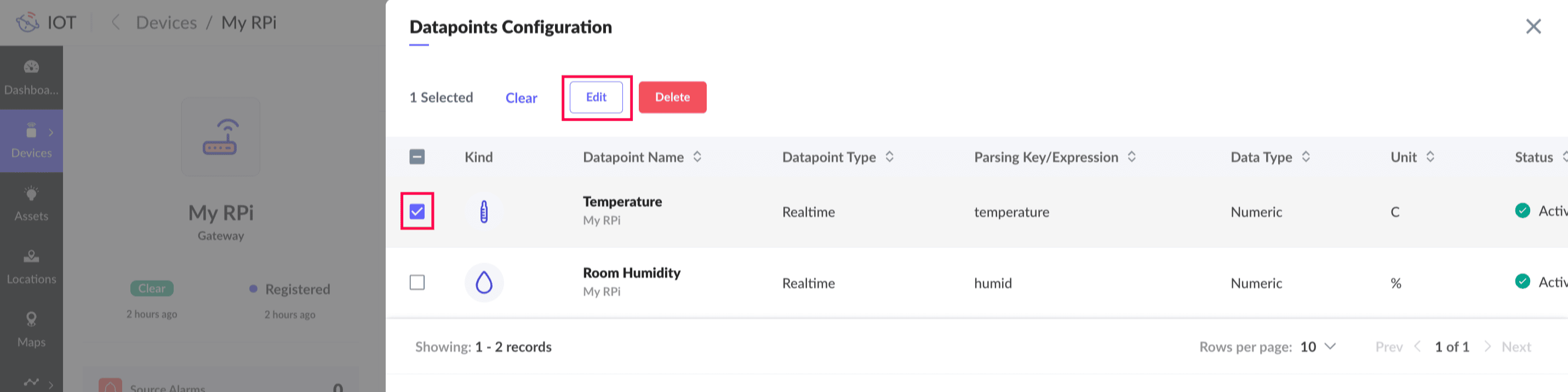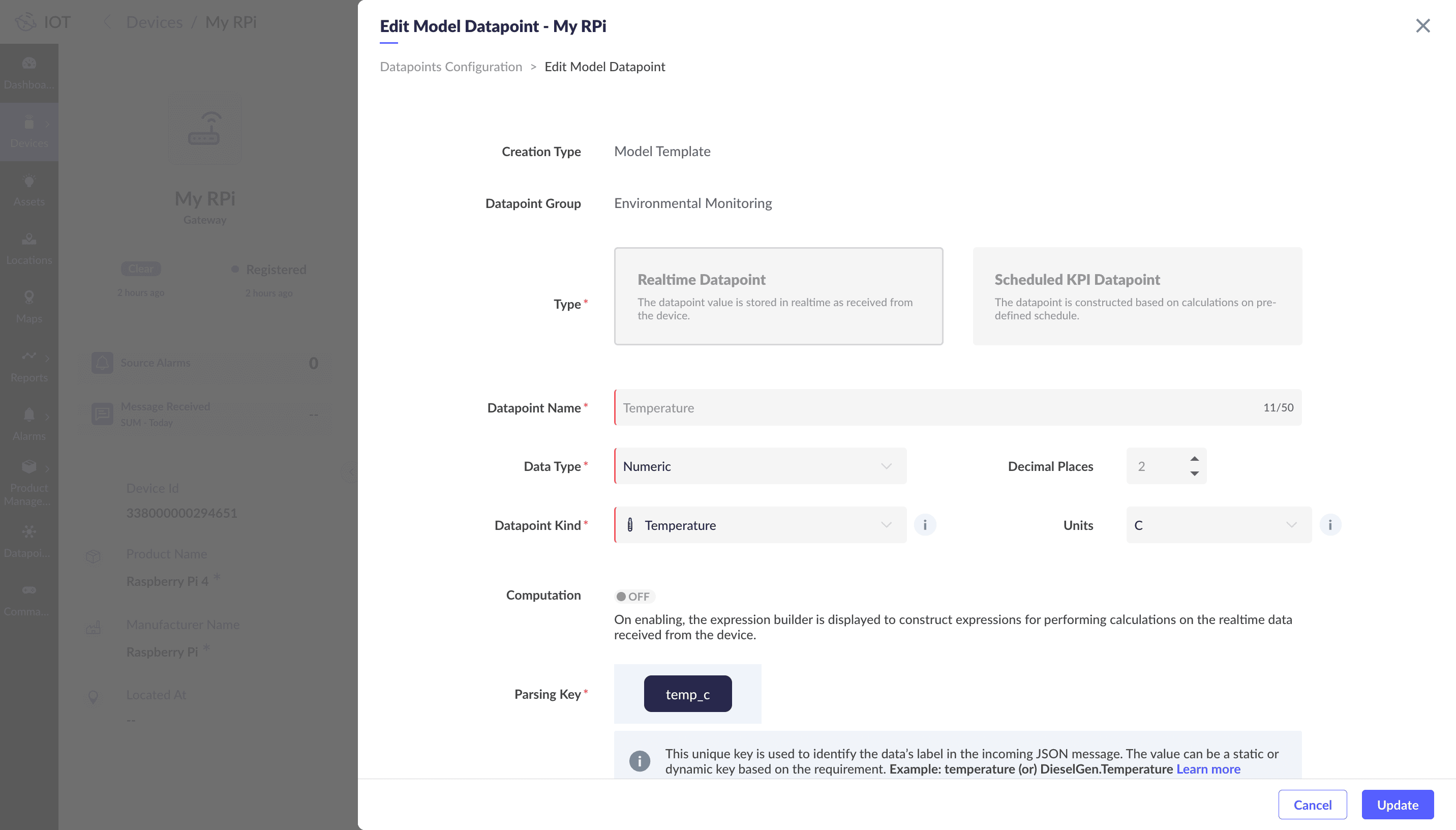 You can modify the parsing key and datapoint status of any datapoint in a device, asset, or location by editing a datapoint in the end application.