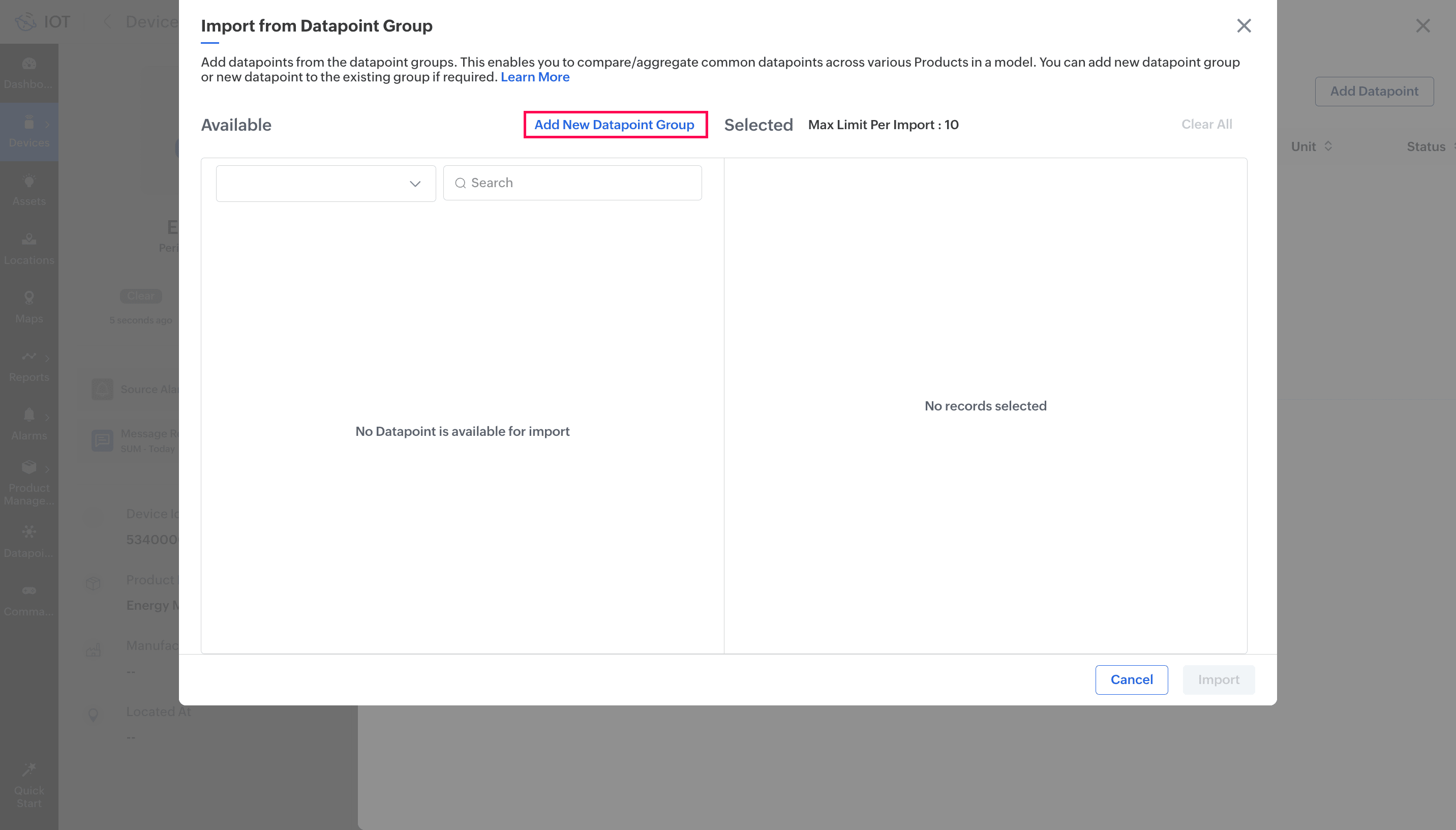 Datapoint templates for a Device model, Asset model, or Location model can be imported directly from predefined datapoint groups. Note: Only Realtime Datapoints without any computation are available in datapoint groups and can be imported. If you ...