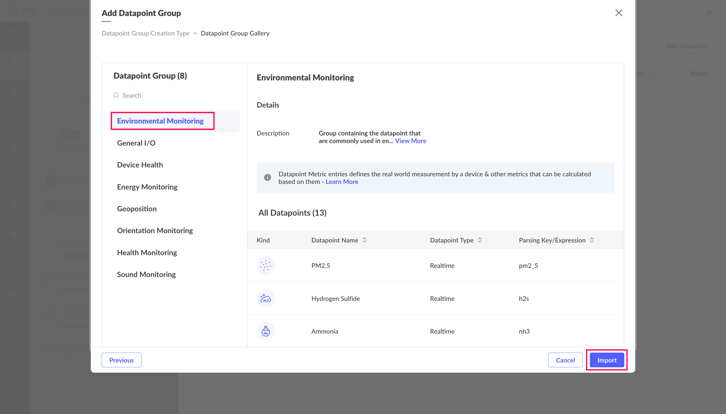 9. Select the datapoint group you want to import. For this illustration, Environmental Monitoring datapoint group is selected.