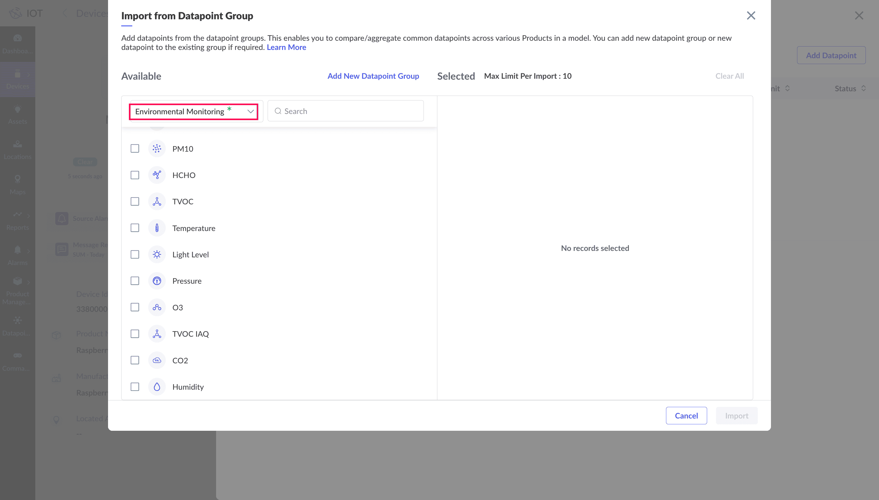 11. Select the datapoint(s) you want to import and click Import. For this illustration, datapoint templates Temperature, Humidity, and CO2 are selected.
