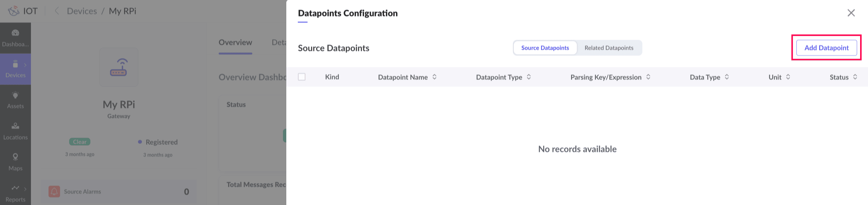 2. Select Devices > Devices in the left pane.You can select Assets to add a datapoint template to an asset or Location to add a datapoint template to a location.