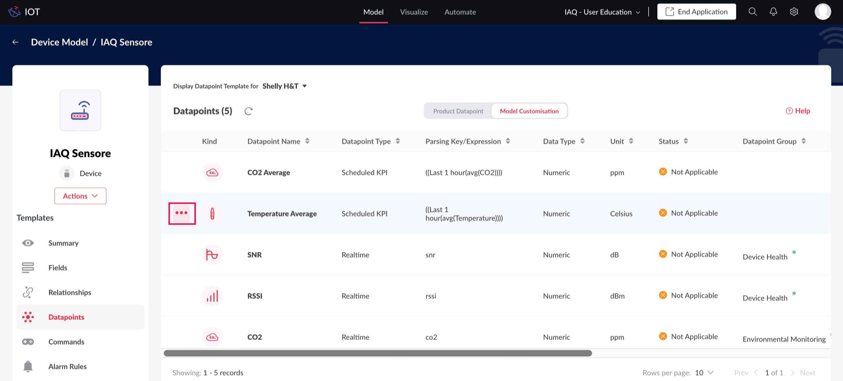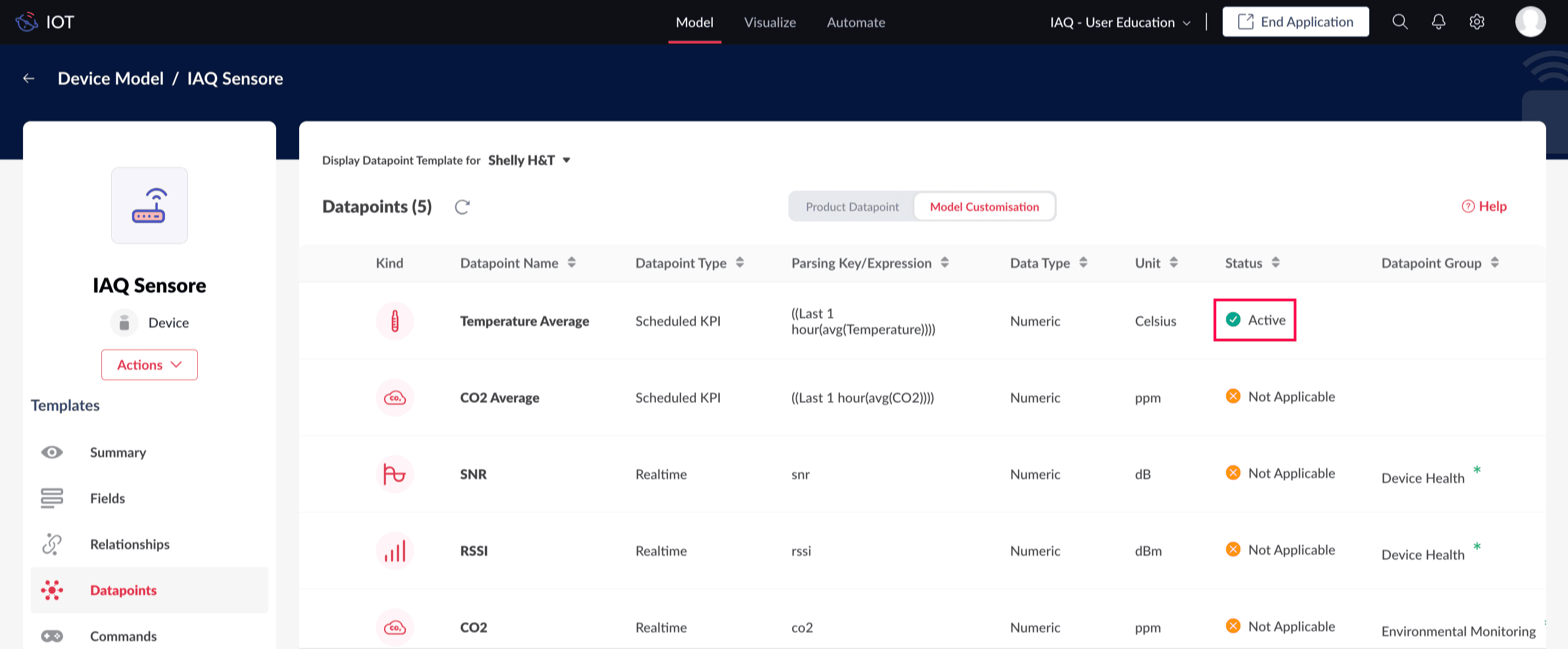 Now, for a device instance created based on the Shelly product and IAQ Sensors model Three datapoints: Temperature, Humidity, Average Temperature are required. While, for a device instance based on the CD10 MerryIoT product and IAQ Sensors model will include seven datapoints: Temperature, Humidity, CO2, RSSI, SNR, Average Temperature, and Average CO2.