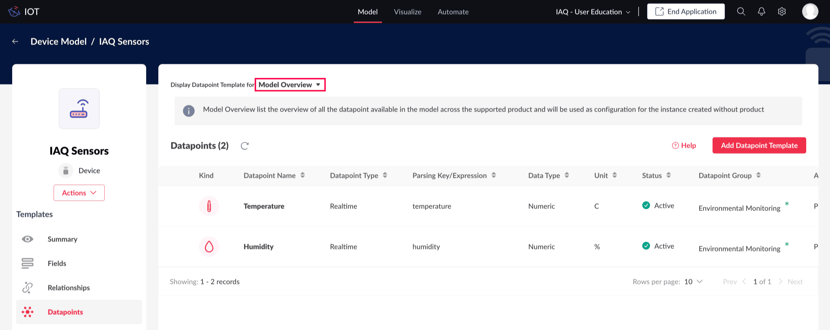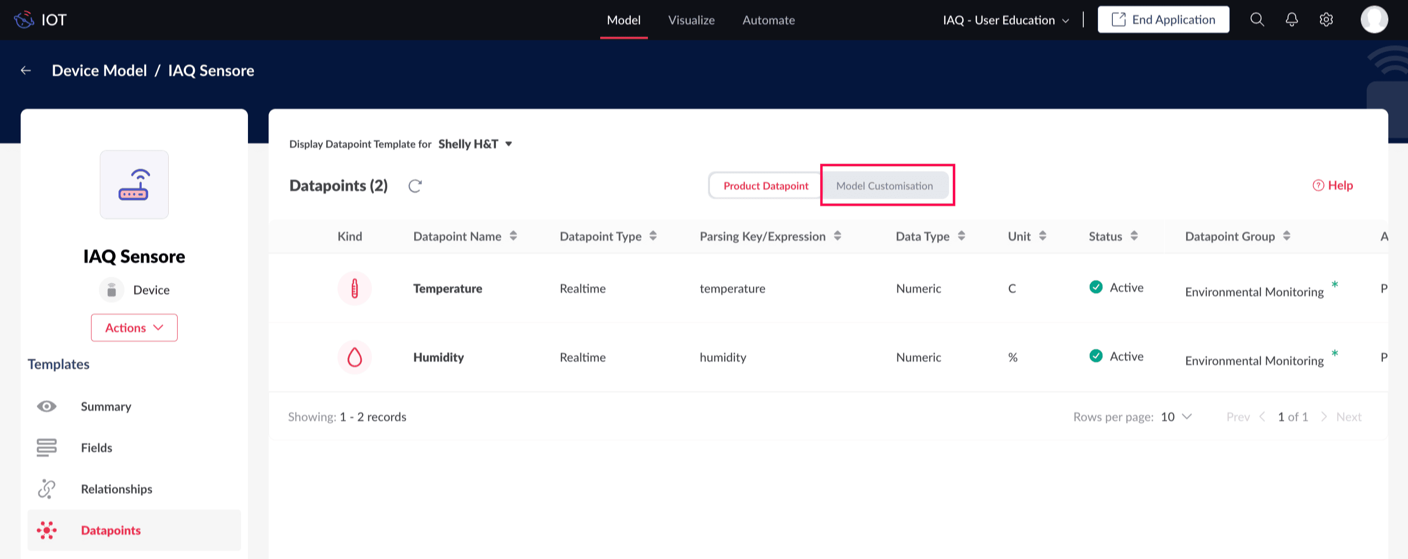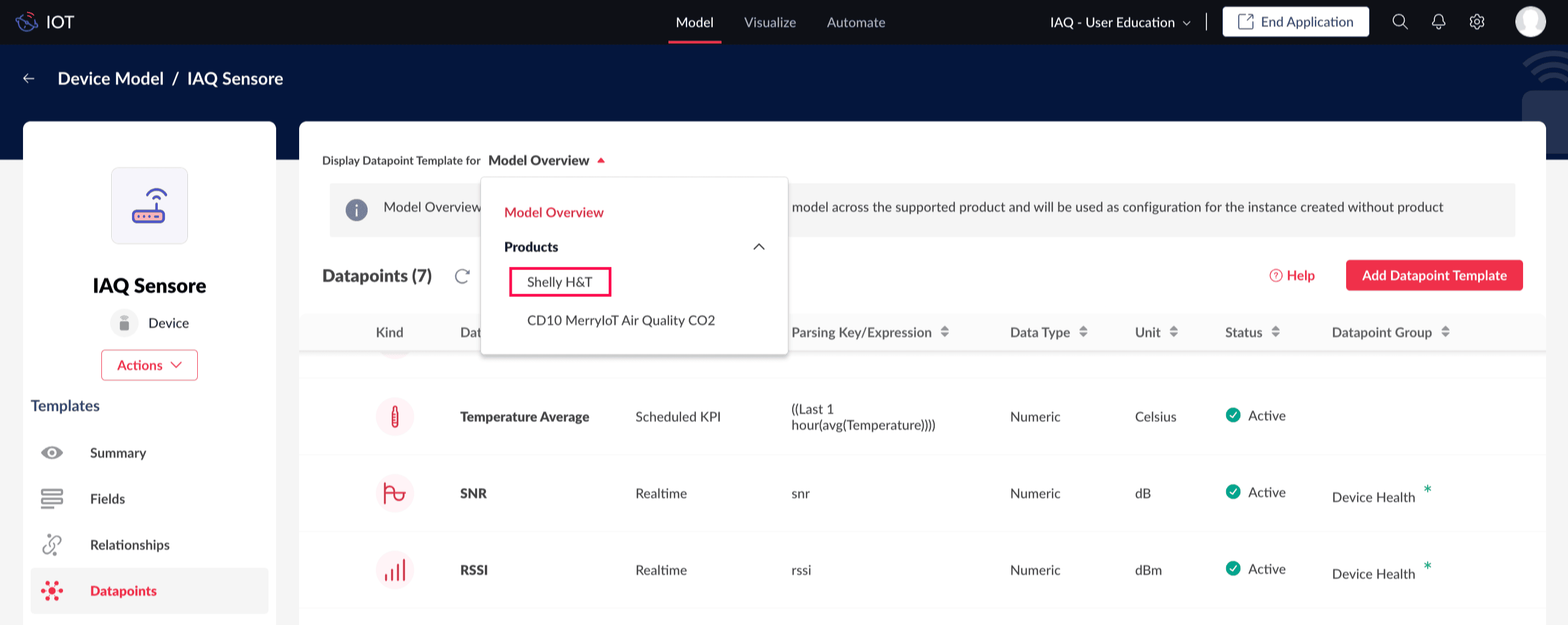 For example, consider two device products used for smart home monitoring: the Shelly H&T and the TBHH100. Both products are linked to the same device model "IAQ Sensors." The Shelly H&T includes two datapoints: Temperature and Humidity. In contrast, the CD10 MerryIoT has five datapoints: Temperature, Humidity, CO2, RSSI, and SNR.