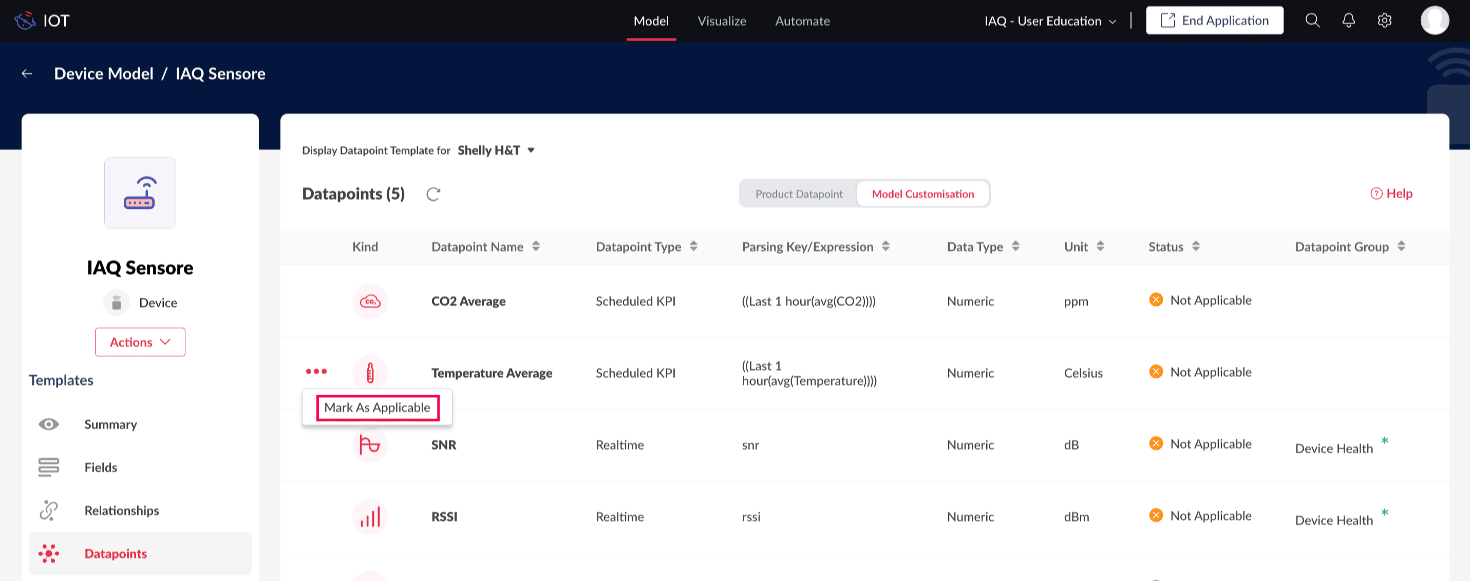 Since, the Average CO2 datapoint is irrelevant for the Shelly H&T, which does not measure CO2 levels, it can be marked as not applicable and the Temperature Average can be marked as applicable for Shelly H&T. This ensures that the Average CO2 datapoint is excluded from devices created based on the IAQ sensor model and the Shelly H&T product.