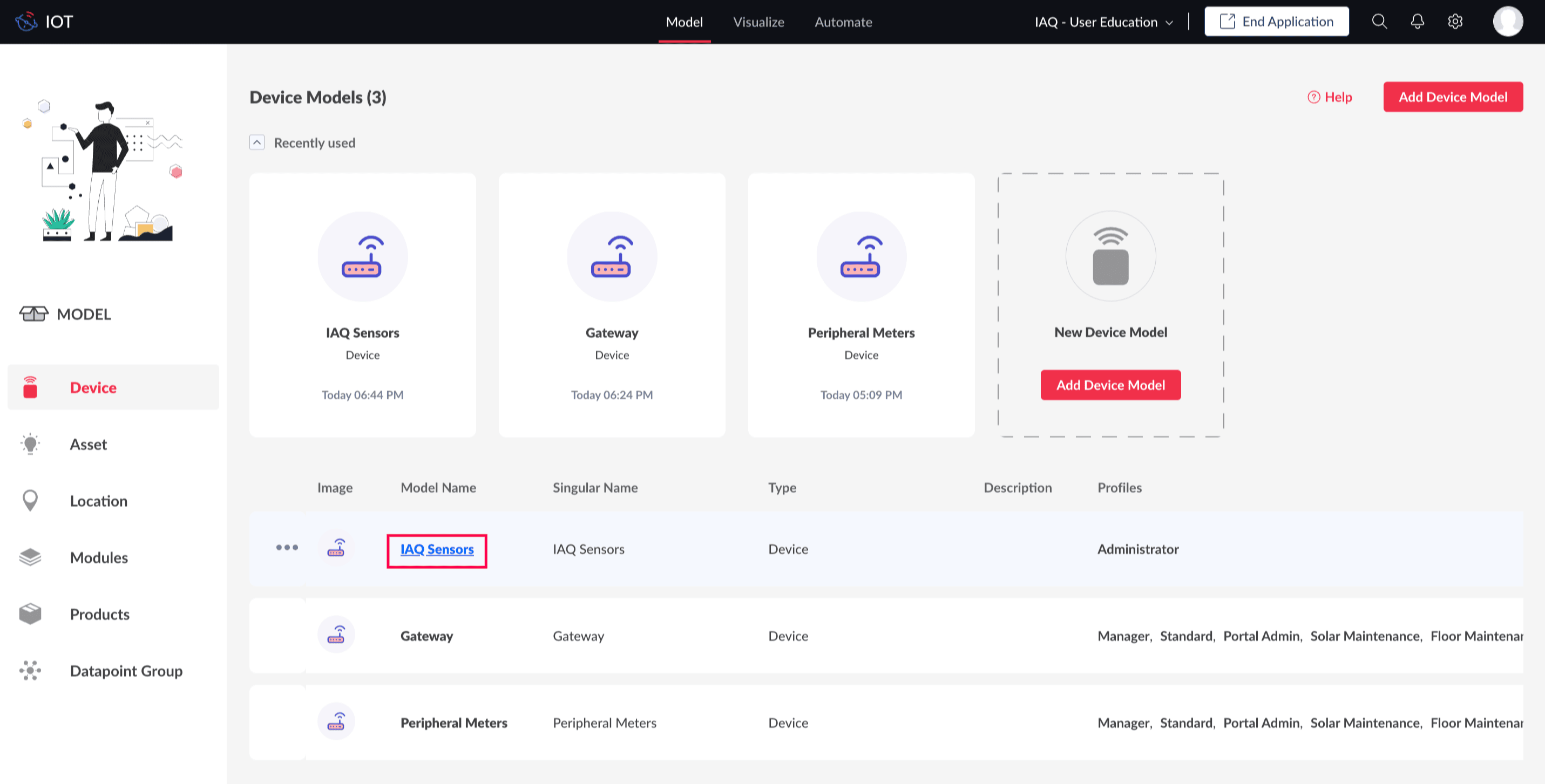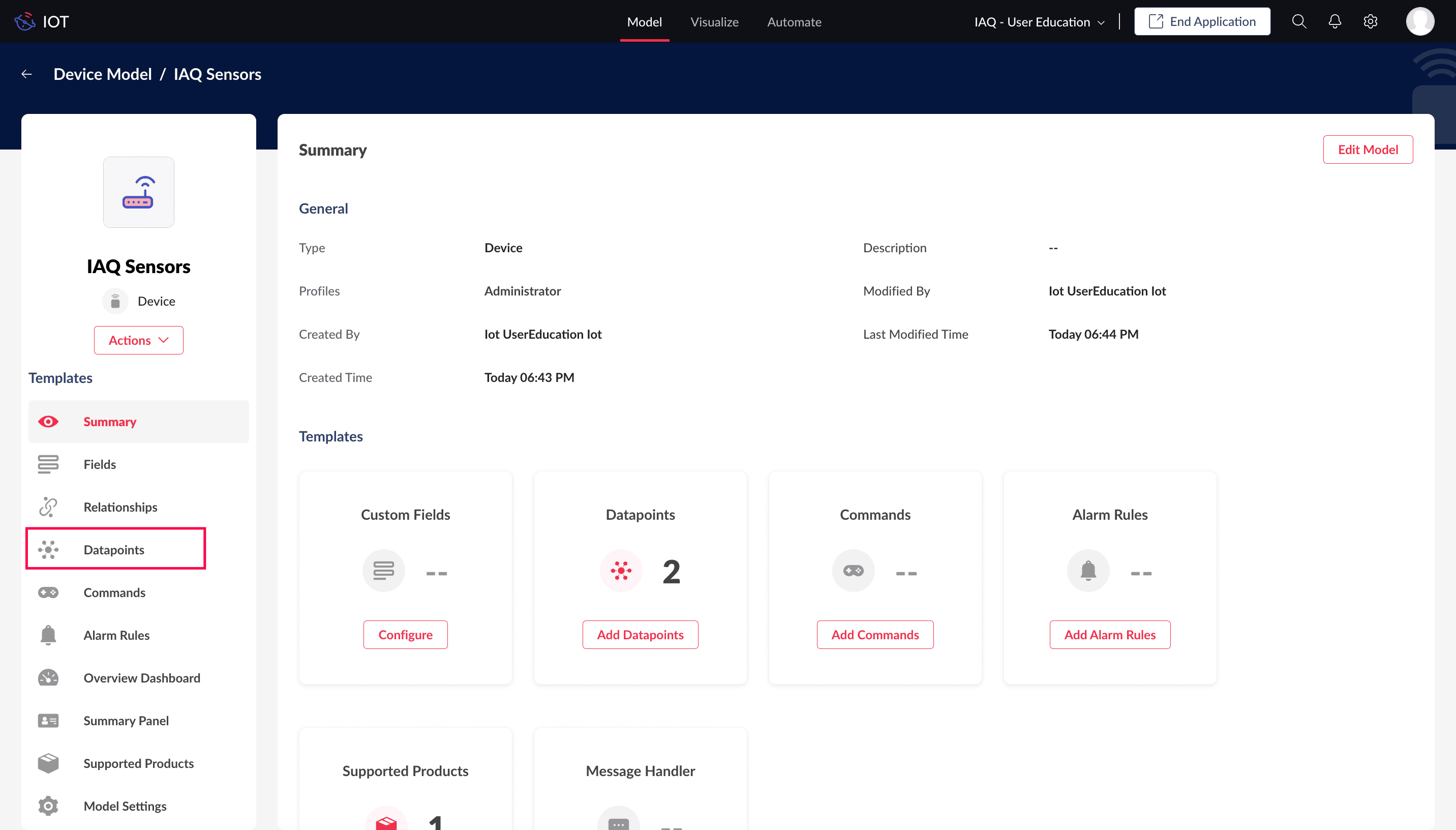 Click on the model for which the products are associated. This will open the device models information page. For this illustration, the device model: IAQ Sensors in considered.