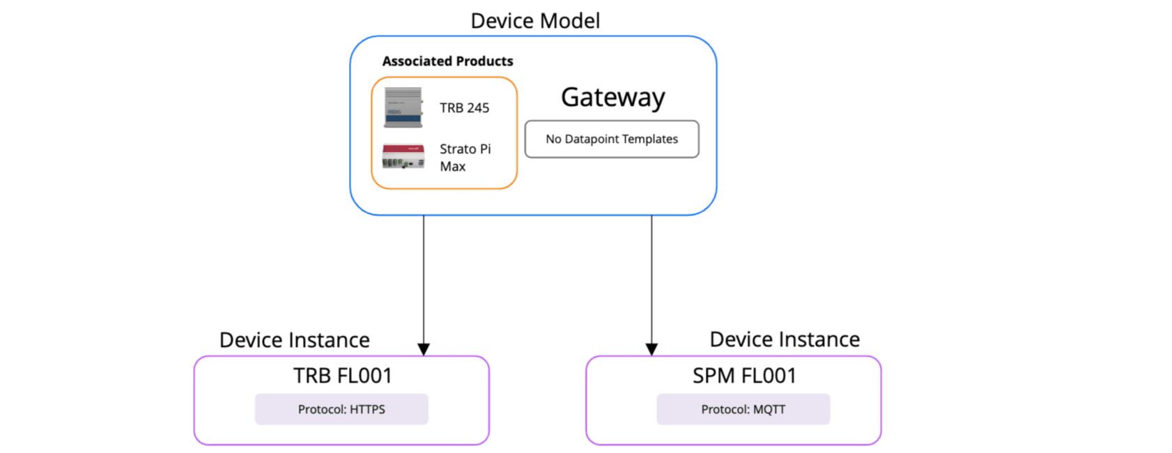 To replicate this setup in the application, you can associate the TRB 245 product with a model named "Gateway" and the CONZERV EM6400NG product to a model called "Energy Meter." Similarly, the Strato Pi Max gateway can be associated with the same "Gateway" model, and the sensors can be linked to a model named "Water Management Sensor".