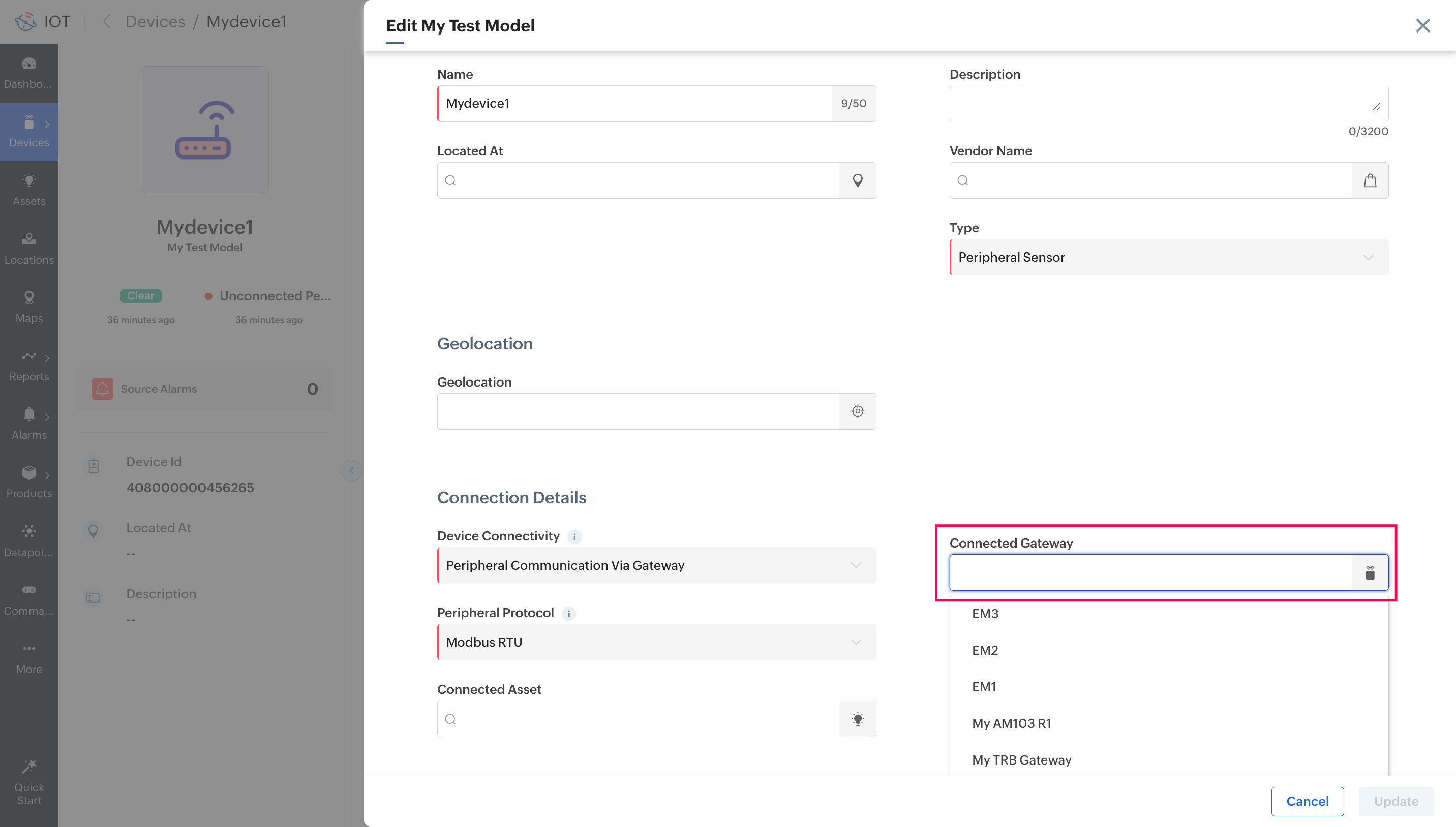 In Zoho IoT applications, peripheral devices are added under the Peripheral Device Type, while gateway devices are added under the Gateway Device Type. To enable data exchange between these device instances within the application, an association must be established. This is done by selecting the appropriate gateway device instance in the "Connected Gateway" field of the peripheral device instance.