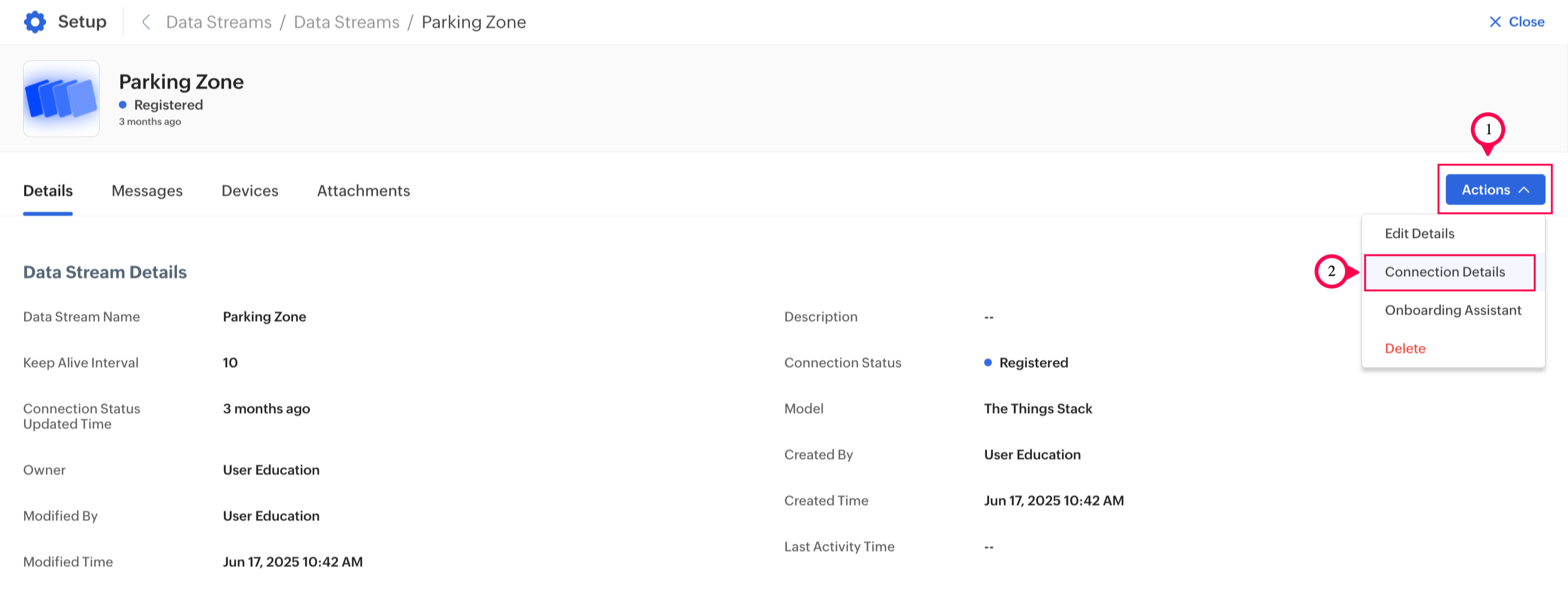 4. Click the datastream for which you want the connection credentials. This will open the datastream's information page. For this illustration, the Parking Zone datastream is considered.