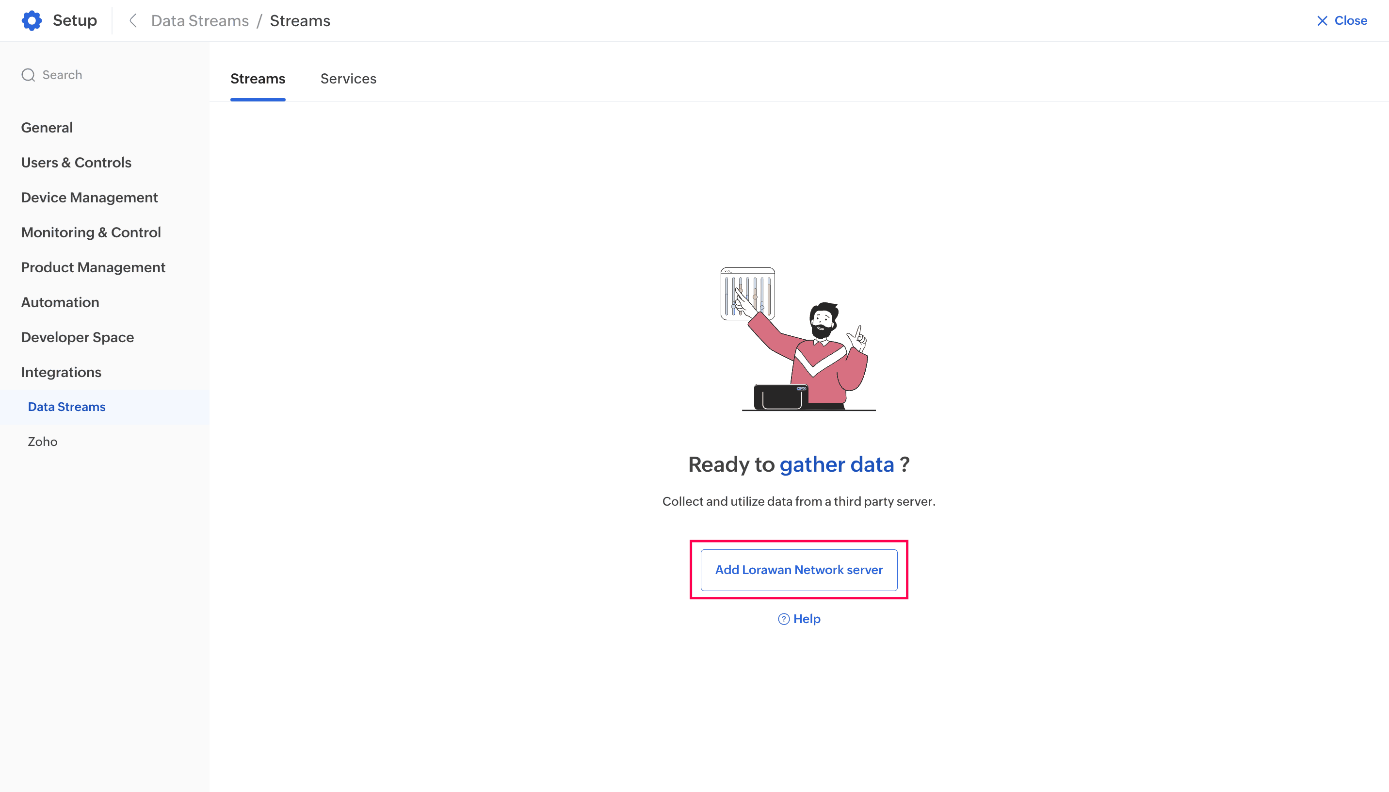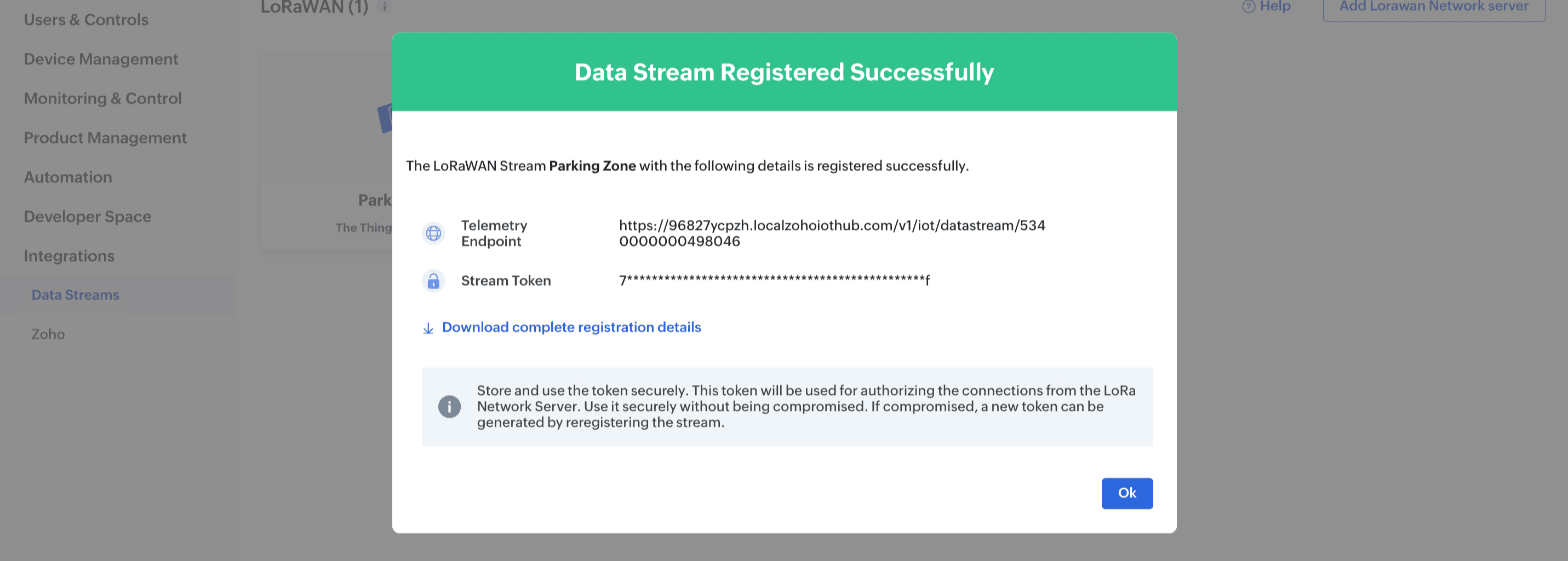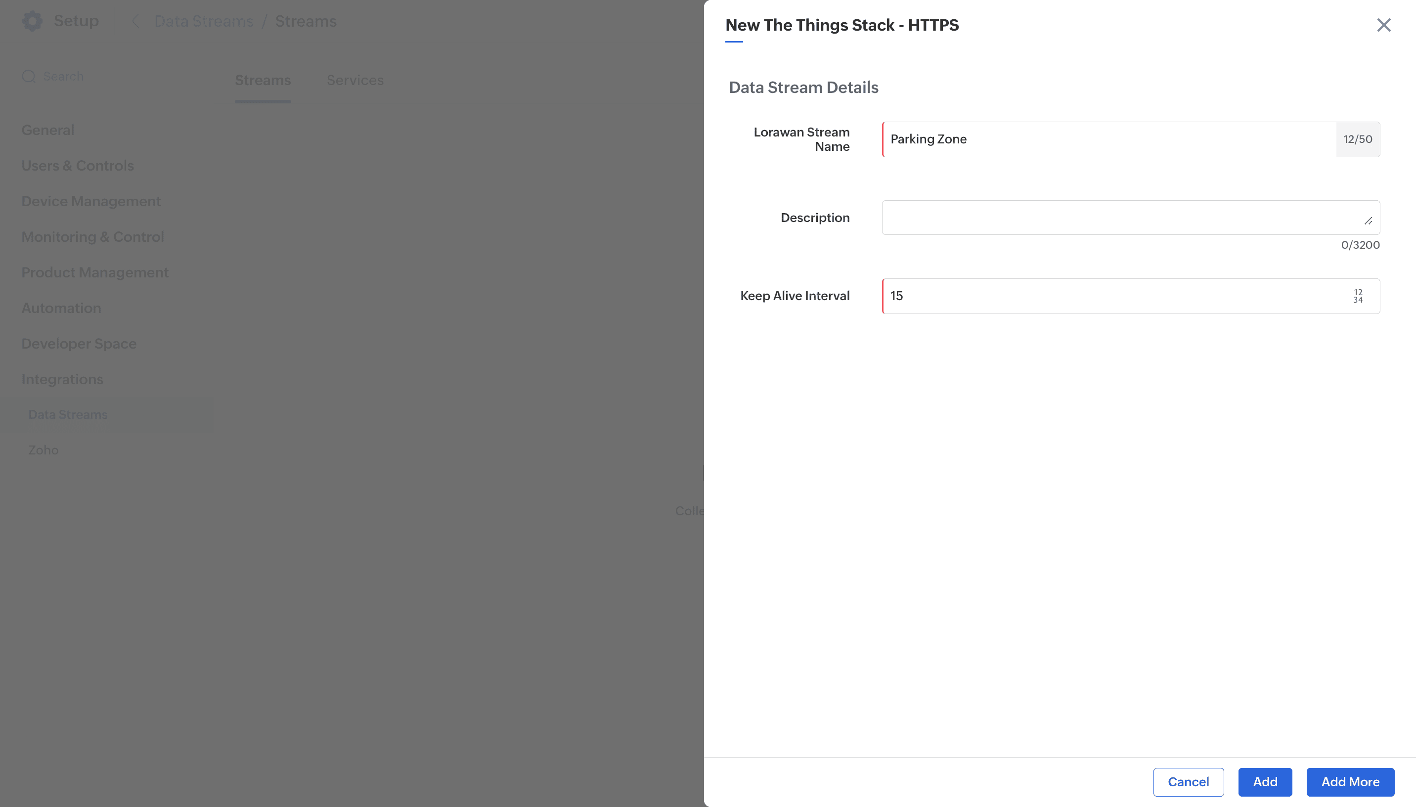 When a datastream is added in the Zoho IoT application, credentials will be generated that can be used to integrate and connect to the corresponding server or system. Datastreams are currently supported only for the LoRa network servers listed here.