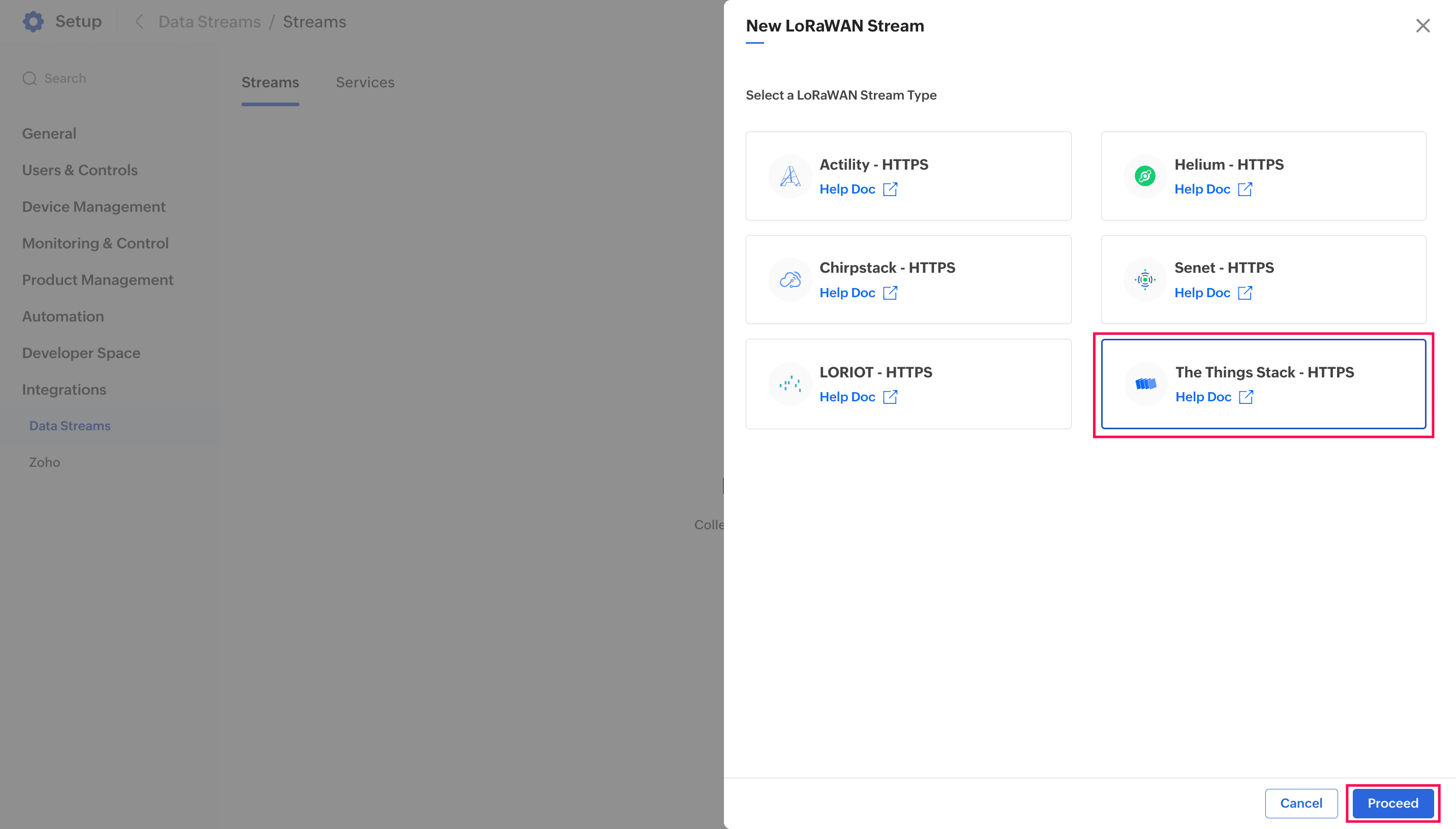 5. Choose the required LNS by selecting the LoRaWAN Stream Type. Then, click Proceed. For this illustration, The Things Stack LoRaWAN network server is selected.