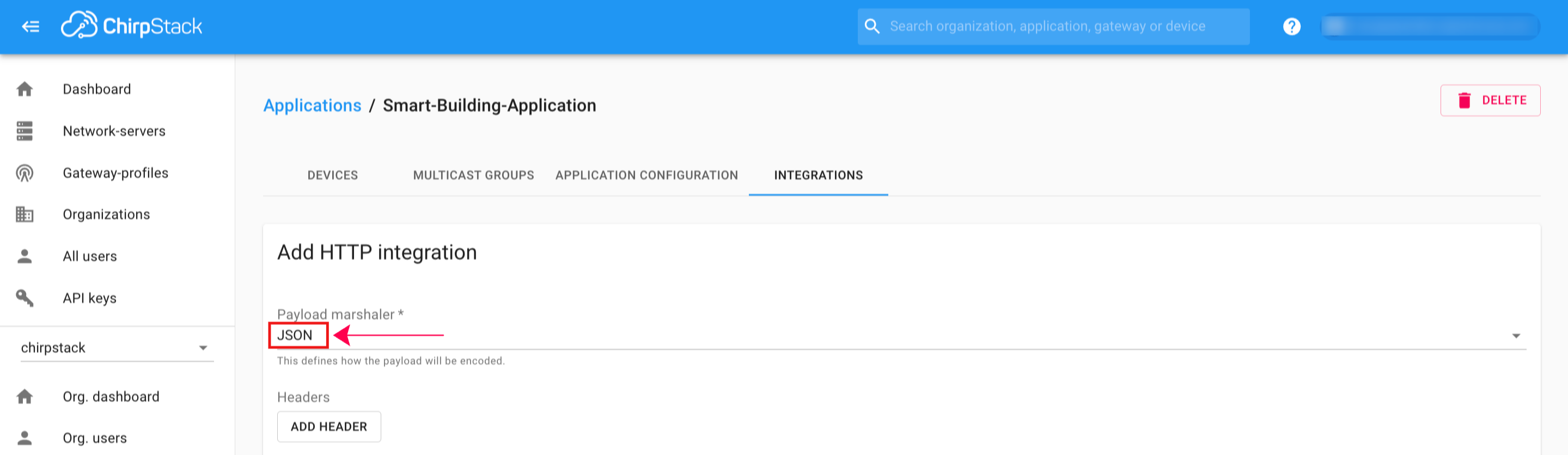 6. Select JSON as the Payload marshaler.