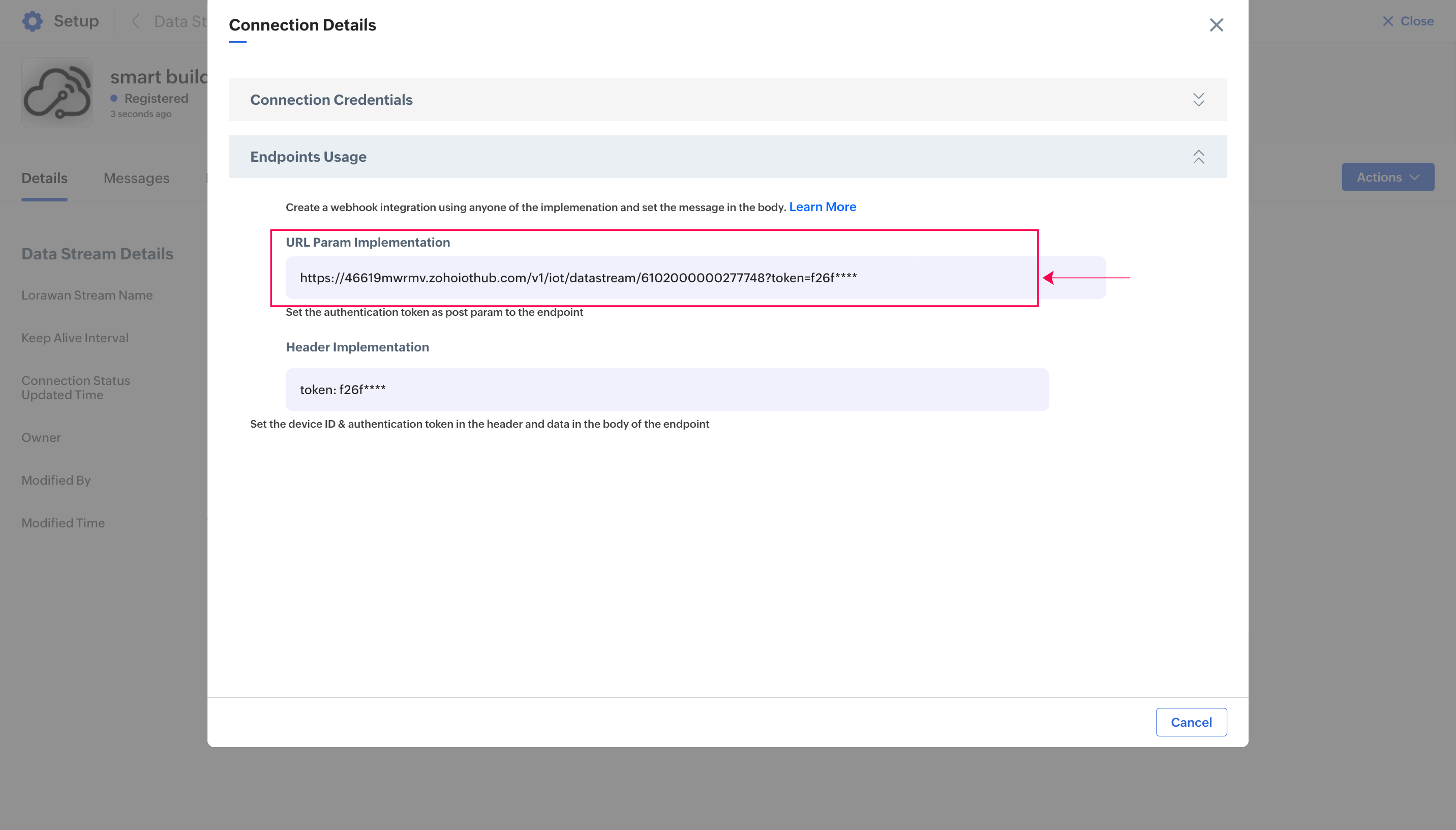 7. Provide the URL Param Implementation value from the datastreams connection credentials in the Endpoints filed.