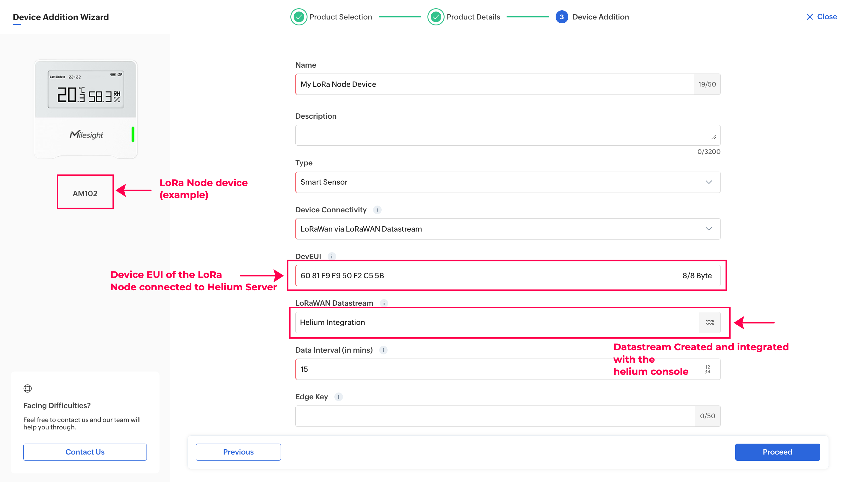 1. Add a LoRa Node device in the Zoho IoT application with the Dev EUI value of the device added/connected to the Helium LNS (Console).